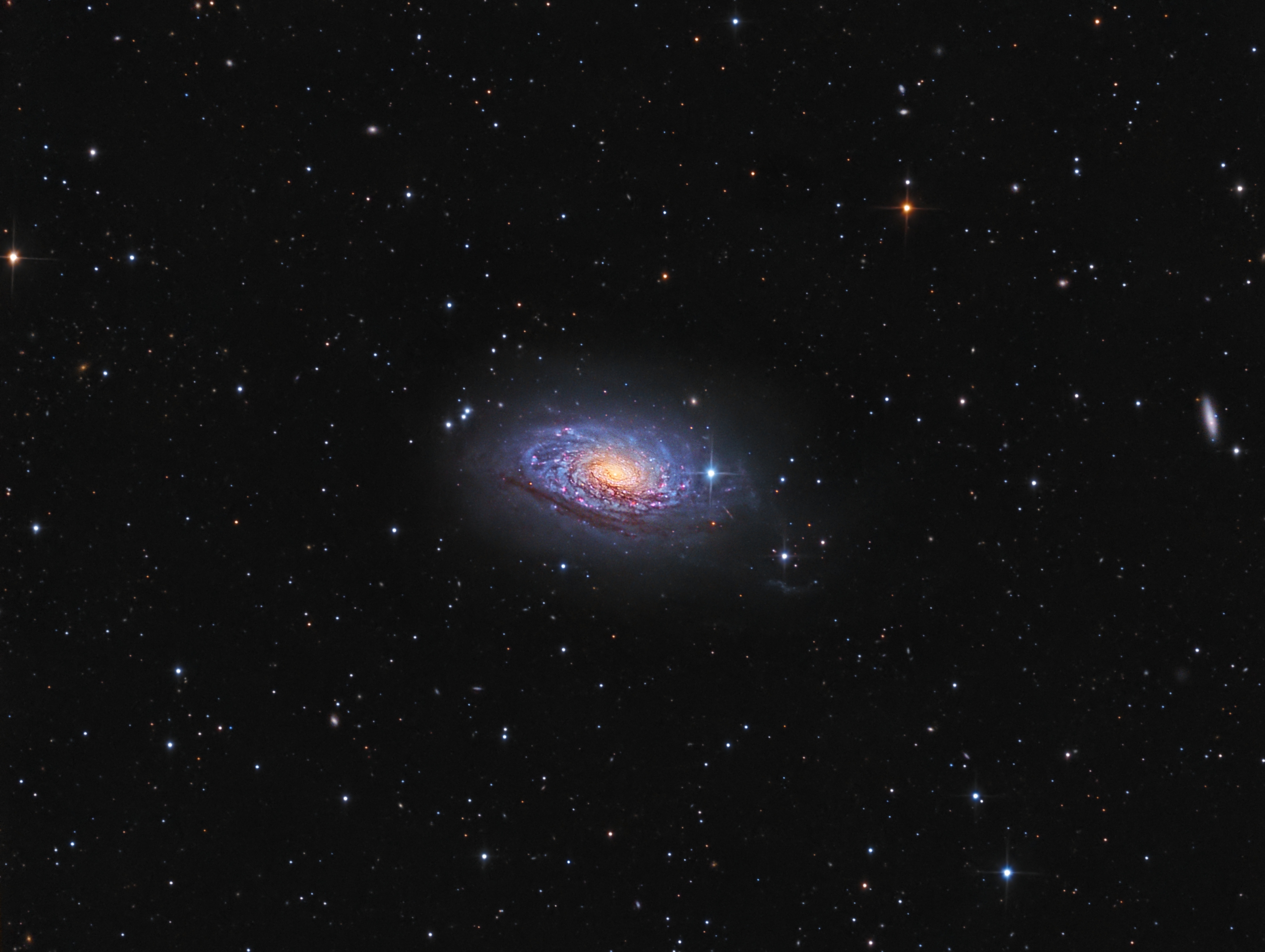 Diese Spiralgalaxie ist ein schönes Objekt zur Beobachtung im Frühling. Ich habe sie nun schon zum dritten Mal abgelichtet. Mit einem Filter gegen Lichtverschmutzung kommen die Sternentstehungsgebiete jetzt noch etwas besser heraus. Dank der Stackingmethode konnte ich auch meine früheren Aufnahmen dazu nehmen und dadurch das Rauschen geringer halten.