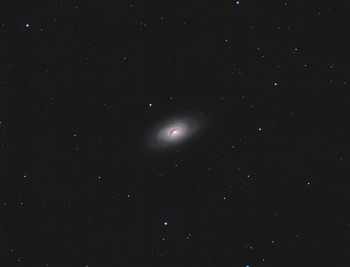 M64, die Galaxie mit dem Schwarzen Auge, ist leicht an dem spektakulären Band aus absorbierendem Staub zu erkennen, das ihren hellen Kern teilweise verdeckt, und zeichnet sich durch ihre bizarre innere Bewegung aus. Das Gas in den äußeren Regionen dieser bemerkenswerten Galaxie rotiert in die entgegengesetzte Richtung wie das Gas und die Sterne in ihren inneren Regionen. Dieses seltsame Verhalten lässt sich auf eine Verschmelzung zwischen M64 und einer Satellitengalaxie vor über einer Milliarde Jahren zurückführen. Neue Sterne entstehen in der Region, in der die gegenläufig rotierenden Gase zusammenstoßen, komprimiert werden und sich dann zusammenziehen. M64 wurde von dem englischen Astronomen Edward Pigott entdeckt. Er befindet sich 17 Millionen Lichtjahre von der Erde entfernt im Sternbild Coma Berenices und lässt sich am besten im Mai beobachten. Mit einer scheinbaren Helligkeit von 9,8 kann die Galaxie Schwarzes Auge bereits mit einem mittelgroßen Teleskop beobachtet werden.