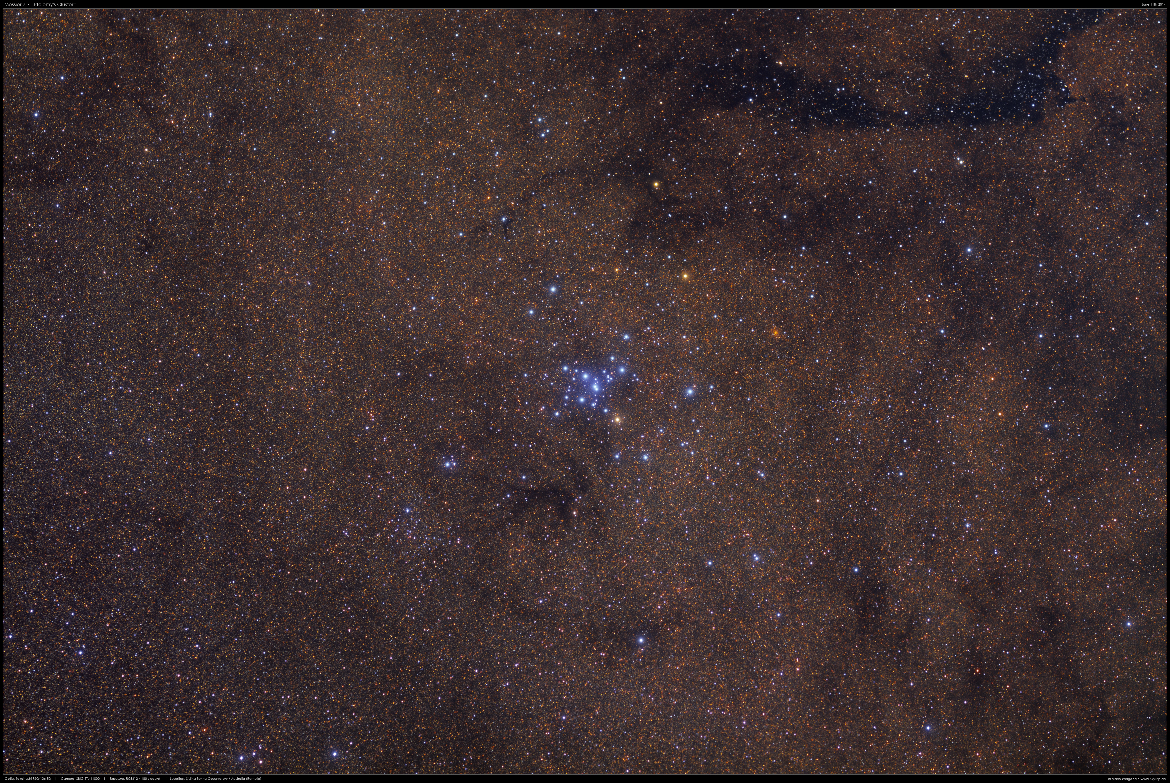 Der offene Sternhaufen Messier 7 (NGC 6475) im Sternbild Skorpion weist eine scheinbare Helligkeit von +3,3 mag und eine Winkelausdehnung von 80 Bogenminuten auf. Damit ist er ein leichtes Objekt für das bloße Auge und löst sich bereits in kleinen Ferngläsern in eine schöne Gruppe heller Sterne auf. Wie die vielfach benutzte Bezeichung "Ptolemäus-Sternhaufen" andeutet, war das Objekt bereits dem ägyptischen Philosophen vor mehr als 2000 Jahren bekannt. Ganz einfach zu beobachten lässt sich M 7 in Mitteleuropa allerdings nicht: Mit einer Deklination von -34° 49' ist er das südlichste Messier-Objekt – eine gute Horizontsicht ist erforderlich.