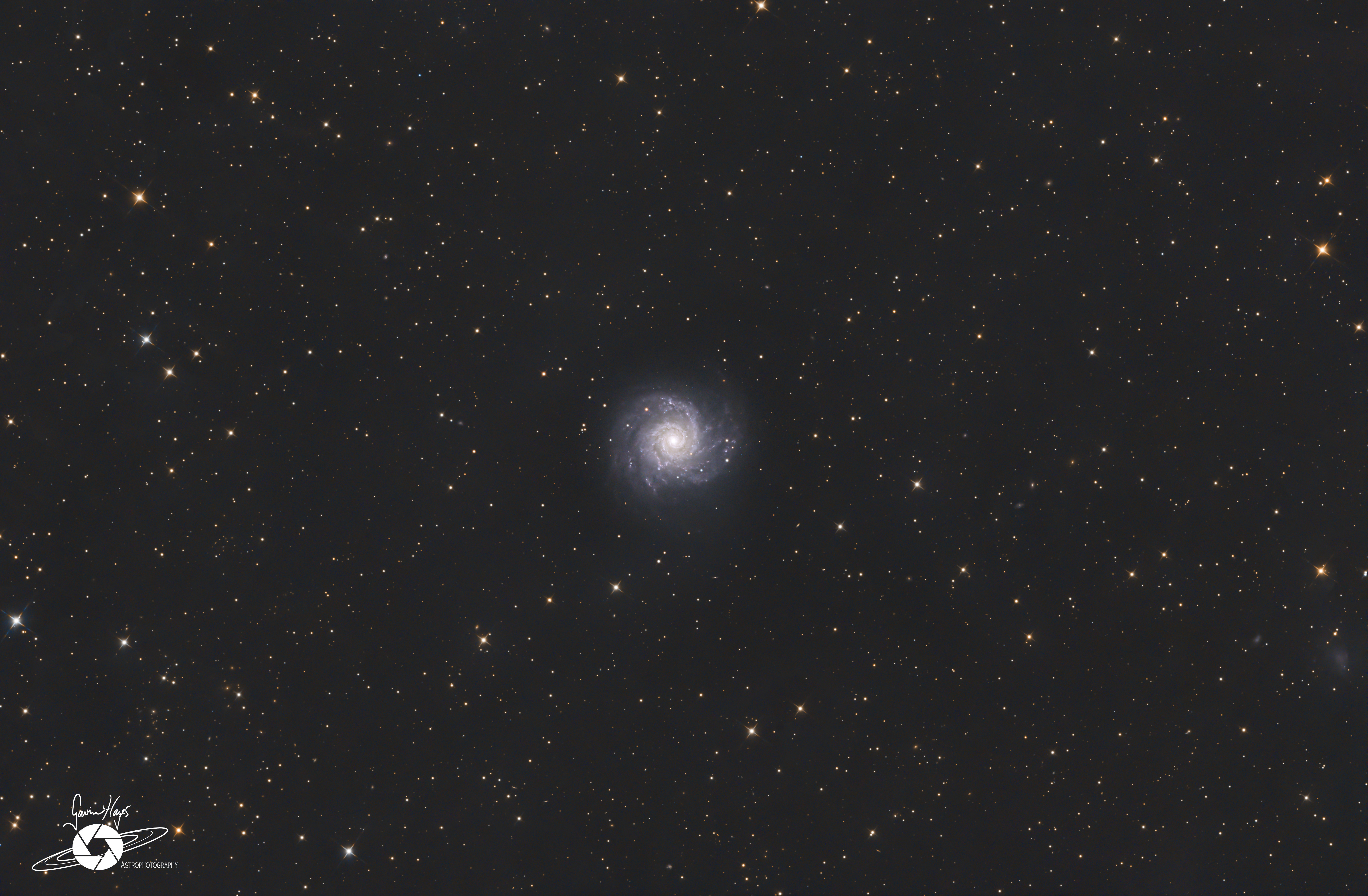 M 74, manchmal auch »Phantomglaxie« genannt, befindet sich in ungefähr 34 Millionen Lichtjahren Entfernung im Sternbild Fische. Wir blicken quasi von oben direkt auf die Galaxie und können ihre komplette Schönheit erfassen. Im Bild befinden sich noch dutzende weitere sehr lichtschwache Galaxien, die zum Teil noch viel weiter von uns entfernt sind. Zu erwähnen wäre das schwache Fleckchen am unteren rechten Bildrand: es handelt sich um ein Paar aus Zwerggalaxien in 24 Millionen Lichtjahren Entfernung (UGC 1171 links und UGC 1176 rechts). Beide haben nur eine Ausdehnung von 8000 bis 10000 Lichtjahren. Diese Galaxie aus der Stadt heraus zu fotografieren, ist sportlich. Mein Wohnort liegt in einer Bortle 6 / 7 Zone. Hier stellt die Deepsky Fotografie schon einige Anforderungen an Fotograf und Ausrüstung. Das Bild wurde in 7 Nächten aufgenommen. Den Bildausschnitt habe ich absichtlich so groß gelassen, da so die Wirkung einer Galaxie in der Tiefe des Raums etwas besser zur Geltung kommt.