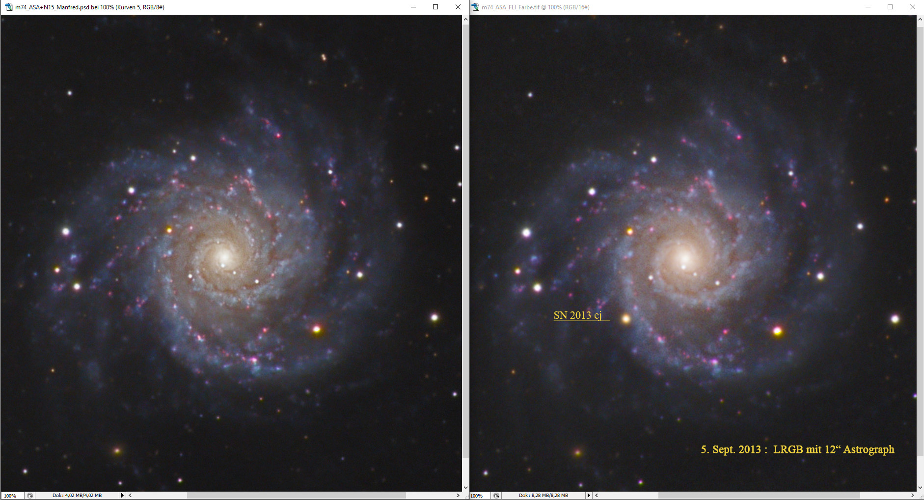 M 74 (NGC 628) gehört wegen ihrer Größe und Orientierung zu den »Grand Design«-Spiralgalaxien. Sie hat die geringste Flächenhelligkeit unter den Messierobjekten und ist etwa 30 Millionen Lichtjahre entfernt. In der Galaxie wurden im 21. Jahrhundert drei Supernovae entdeckt: SN 2002ap, SN 2003gd (12. Juni 2003) und die Supernova SN 2013e. Diese ist im Vergleichsbild mit dem Foto aus 2020 zu sehen.