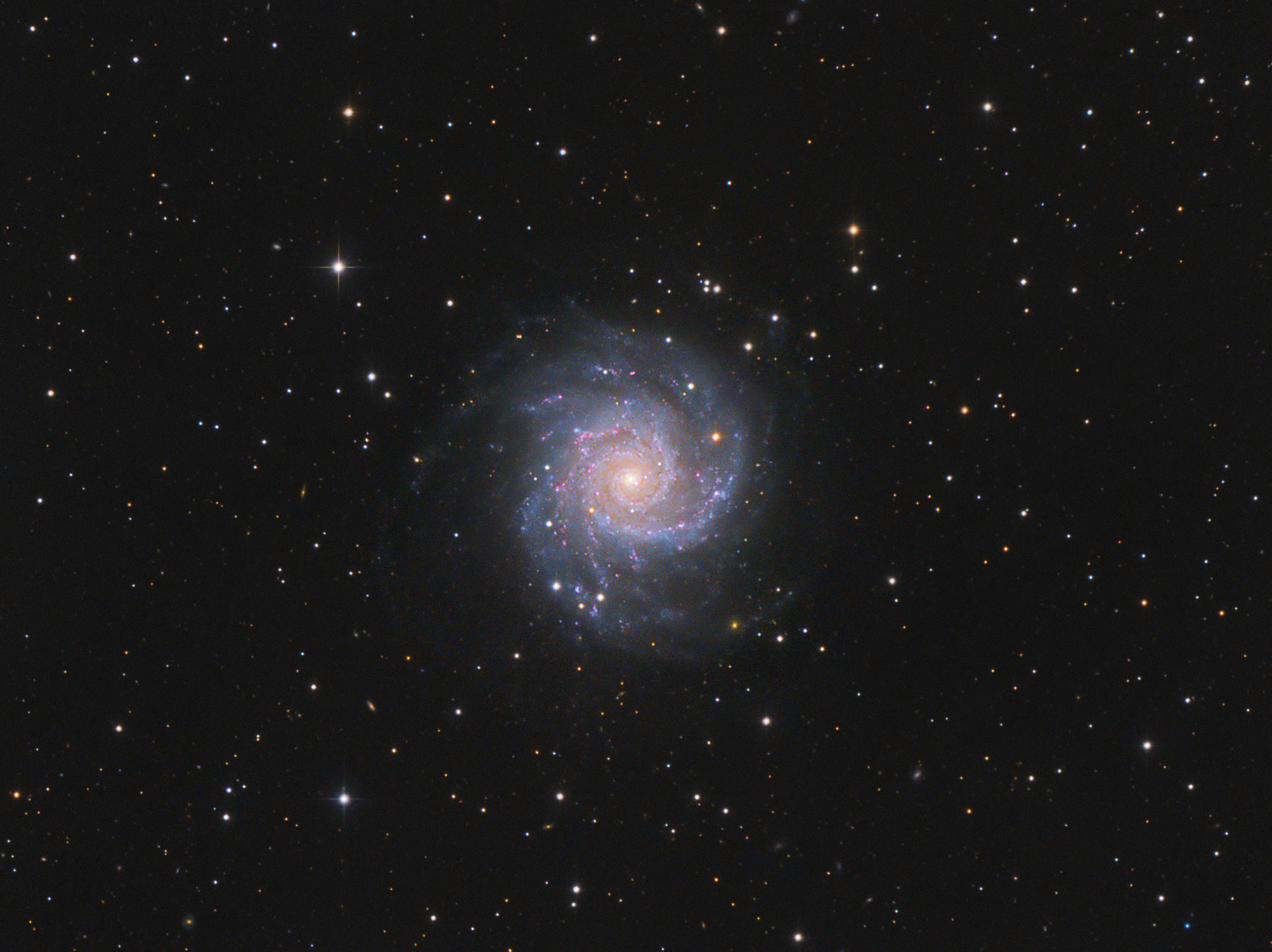 M 74 wird auch Phantom-Galaxie genannt, weil sie durch ihre sehr geringe Flächenhelligkeit visuell kaum zu sehen ist. Ich hab's versucht und konnte sie mit den Acht-Zoll-Newton gerade noch erkennen. Am fertigen Bild mit mehr als acht Stunden Belichtungszeit sieht man sie dann schon etwas besser.