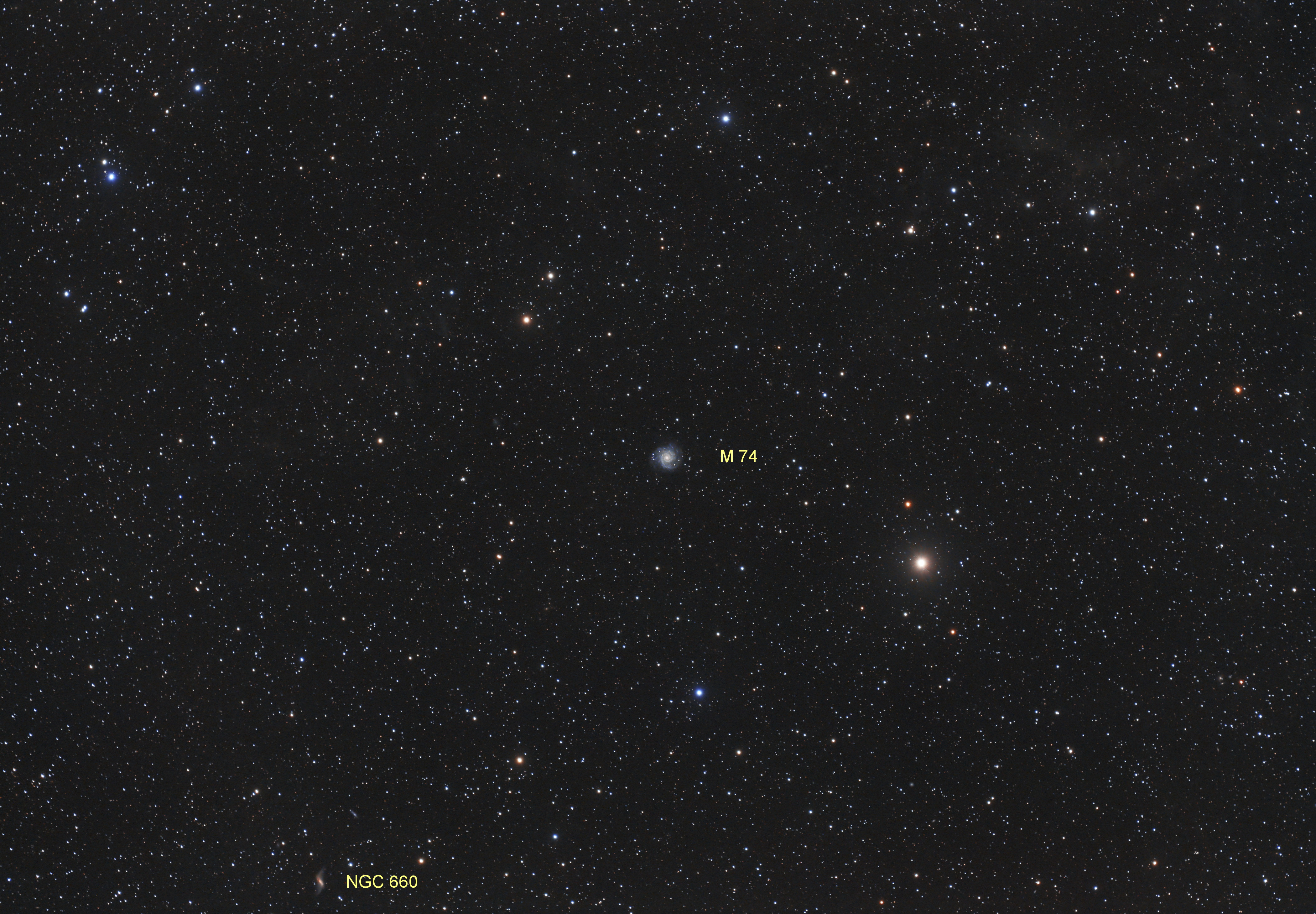 Messier 74 ist eine Spiralgalaxie im Sternbild Fische. Für ihre Entfernung werden Werte um 30 Millionen Lichtjahre angegeben. NGC 660 (links am unteren Bildrand) ist eine Balkenspiralgalaxie in etwa 42 Millionen Lichtjahren Entfernung. Sie zählt zu den sogenannten Polarring-Galaxien.