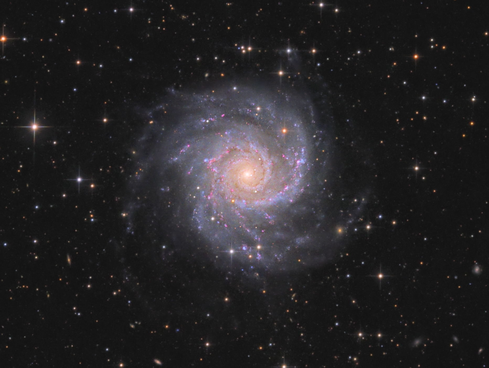 Messier 74 in den Fischen ist eine relativ große Galaxie (10x9,5arcmin), aber von relativ geringer Oberflächenhelligkeit. Eine schöne offene SA-Spirale face on, in rund 30 Millionen Lichtjahren Entfernung, und mit schönen Sternknoten und HII-Gebieten in den Armen. www.astrobin.com/mk93zg/