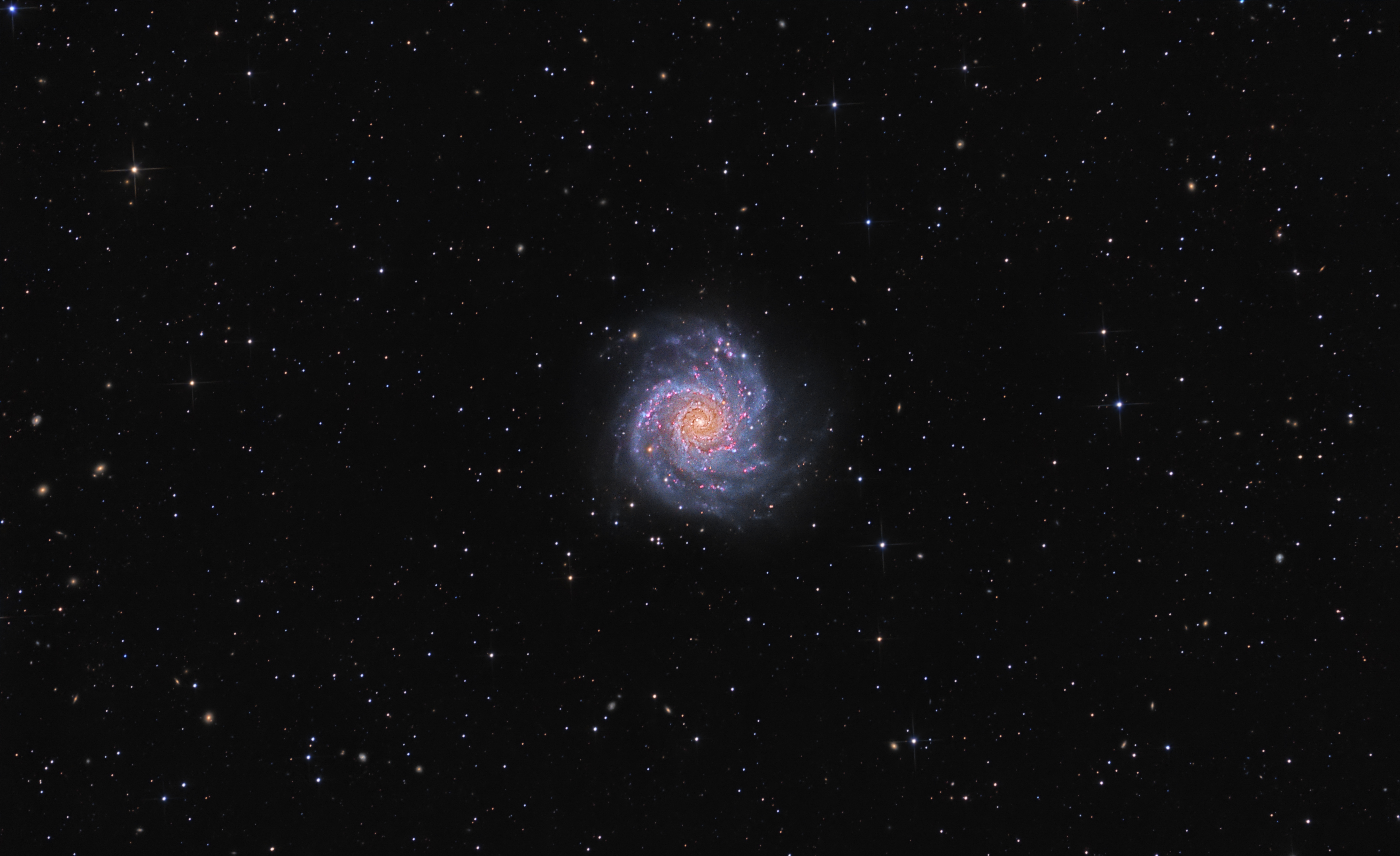 Bei dieser Spiralgalaxie sehen wir praktisch senkrecht auf die galaktische Ebene. Mit einer Ausdehnung von 10,5 x 9,5 Winkelminuten, einer Helligkeit von 9,1 mag und einer geschickten Position am Himmel scheint es ein einfaches Fotomotiv zu geben. Aber weit gefehlt. Wegen der geringen Flächenhelligkeit wird sie geradezu zur Herausforderung. Nun habe ich 223 Aufnahmen aus 2018 mit weiteren 185 Belichtungen mit Lichtverschmutzungsfilter zu einem Bild zusammengefügt. Erst dadurch gelang es mir Strukturen ohne zu viel Rauschen herauszuarbeiten. Dank Filter kommen HII Regionen deutlich heraus, von denen es bei Messier 74 genug gibt.