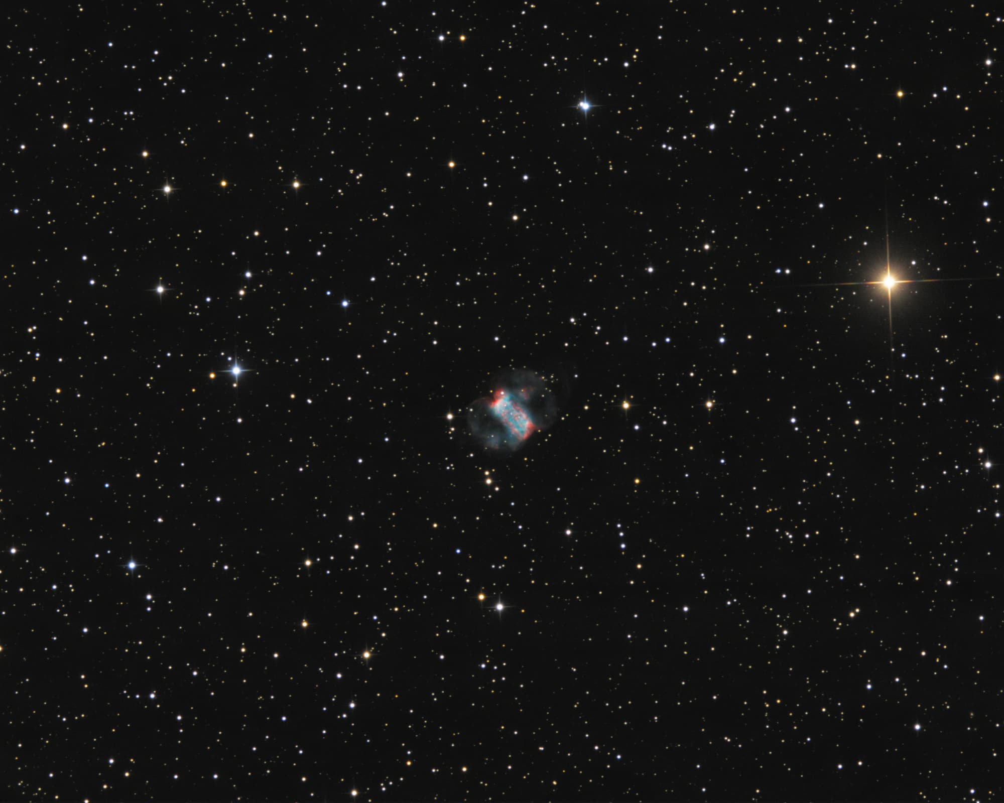 Es handelt sich um eines der letzten Bilder, die ich mit meinem 12"-Astrografen aufgenommen habe. Die Nächte im Herbst 2016 waren klar, aber die Transparenz war teilweise durch Zirren getrübt. Dennoch bin ich mit dem Ergebnis recht zufrieden. Es ist für mich die vierte fotografische Begegnung mit dem kleinen Hantelnebel nach früheren Besuchen mit einem Celestron 11, einem VMC260L und dem 24"-Hypergrafen "Ganymed".