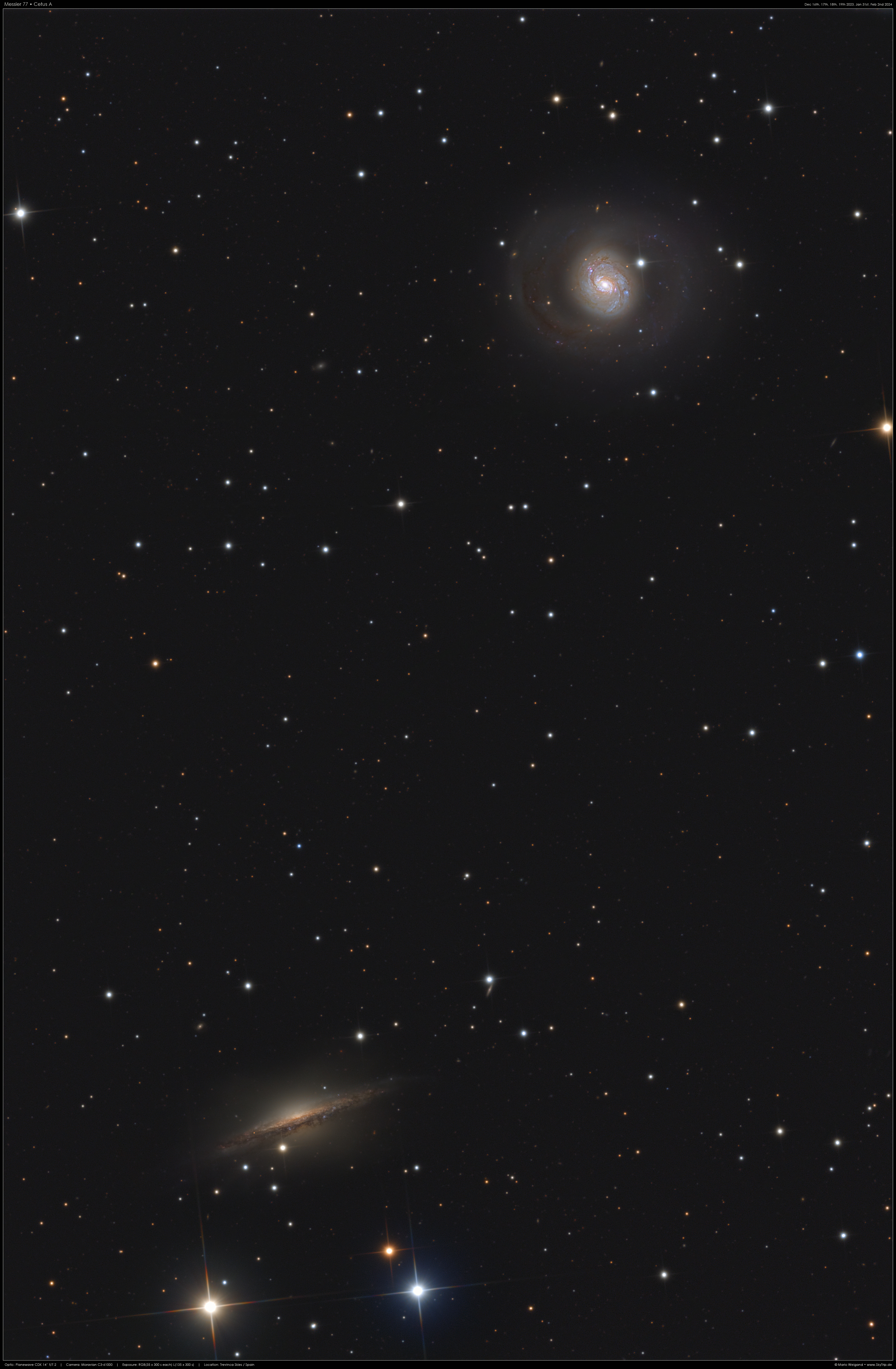 Messier 77, auch bekannt als NGC 1068 oder »Tintenfischgalaxie«, ist eine Balkenspiralgalaxie. Sie liegt etwa 47 Millionen Lichtjahre von uns entfernt im Sternbild Walfisch (Cetus). Die Morphologie von M 77 ist besonders und wird mit (R)SA(rs)b angegeben, wobei »(R)« für eine äußere ringförmige Struktur steht, »SA« für eine Spirale ohne Balken, »(rs)“ für eine innere Ringstruktur und »b« für mäßig gewundene Spiralarme. Eine weitere Besonderheit: Bei M 77 handelt es sich um eine aktive Galaxie mit einem aktiven galaktischen Kern (AGN), der aber im sichtbaren Licht durch Staub verdeckt wird. Sie ist die hellste und eine der uns nächstgelegenen und am besten untersuchten Seyfert-Galaxien vom Typ 2. Unten im Bild ist außerdem die interessante Balkenspiralgalaxie NGC 1055 zu sehen. Für diese Aufnahme wurde insgesamt 20 Stunden mit einem Planewave CDK 14 Zoll f/7,2 und einer Moravian C3-61000 (bin 2 x 2) belichtet. http:/www.skytrip.de