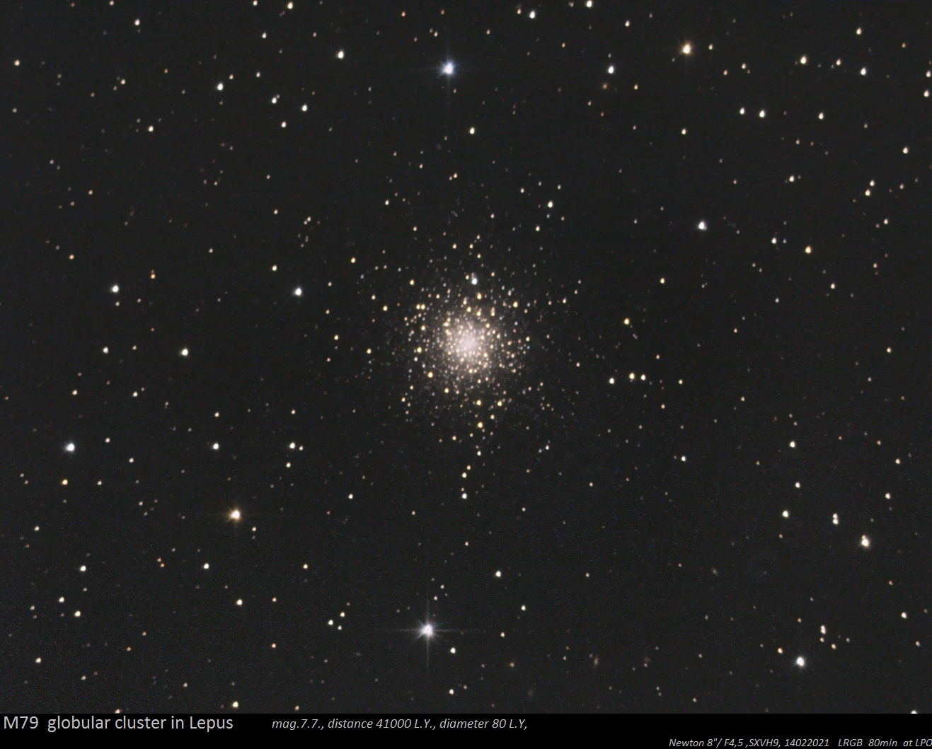 Der Kugelsternhaufen Messier 79 in Sternbild Hase unter dem Orion wird oft visuell und fotografisch vernachlässigt. Dabei ist er sehr hell (7,7 mag) und fast dreimal so weit entfernt als Messier 13, nämlich 41000 Lichtjahre.