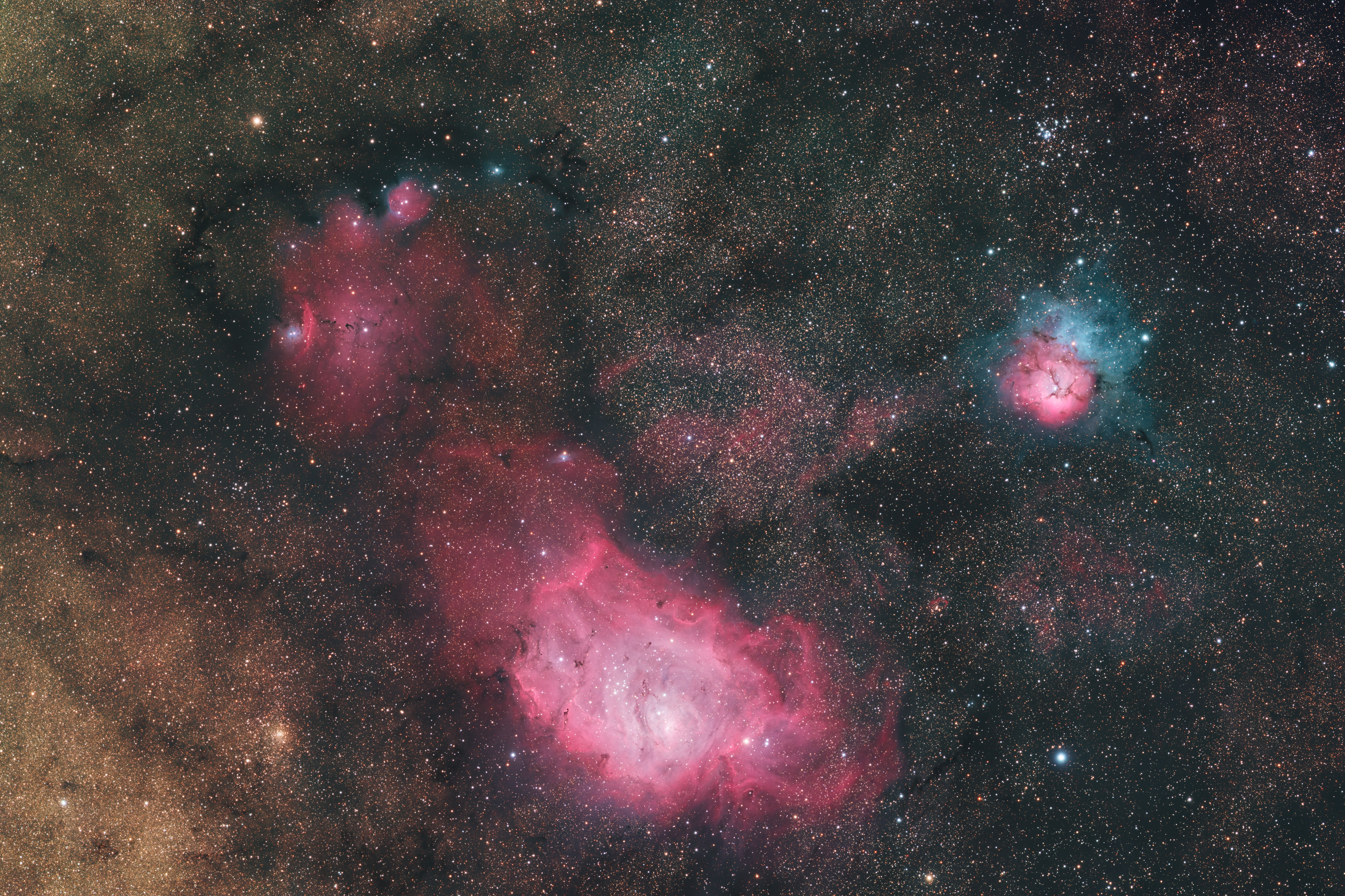 Normalerweise sollte man ja keine Himmelsobjekte unterhalb von ca. 30° aufnehmen – zu groß ist die Luftmasse, die durchdrungen werden muss, zu schlecht das Seeing, so knapp über dem Horizont. Mit etwas Ausdauer kann es jedoch gelingen! An meinem Standort im oberösterreichischen Innviertel steigen Messier 8 und 20 nicht höher als ca. 17 bis 18 Grad über den Horizont. Dabei muss drei bis fünf mal so viel Atmosphäre durchdrungen werden, als dies bei höher stehenden Objekten der Fall wäre. Viel Geduld ist erforderlich, um Nächte mit ruhigen atmosphärischen Bedingungen zu erhaschen! Des Weiteren kann man das Ergebnis mit einer entsprechenden Zahl an Einzelbelichtungen verbessern – hier hilft dann die Deconvolution mittels moderner Bildbearbeitungs-Software. Durch die Verwendung eins Vollformatsensors mit kleinen Pixeln erreiche ich ein weites Feld mit dennoch hochauflösenden Details. Eine Streifzug durch diese phantastische Himmelsregion in 100%-Auslösung lohnt sich also!