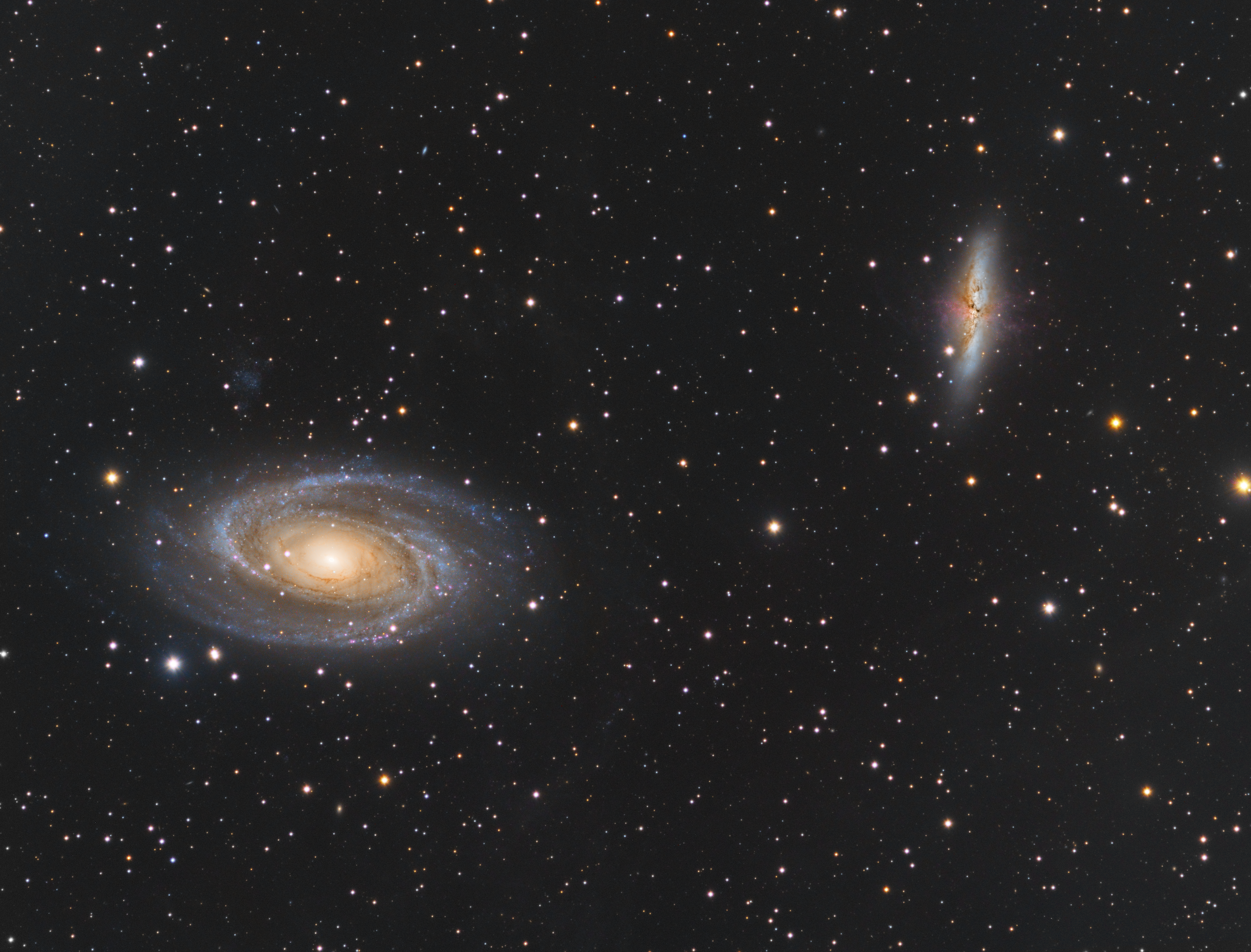 In den letzten zwei Jahren habe ich etwa 30 Stunden an Daten von Messier 81/82 gesammelt, um den IFN detailliert hervorzuheben. Das ist mir zwar gut gelungen, jedoch ist es so gut wie umöglich dabei, die Galaxien und den Hintergrund nicht überzustrapazieren. Deshalb habe ich in dieser Version den IFN ignoriert und mich auf eine schöne Abbildung der Galaxien und Sterne mit einem rauscharmen Hintergrund konzentriert.