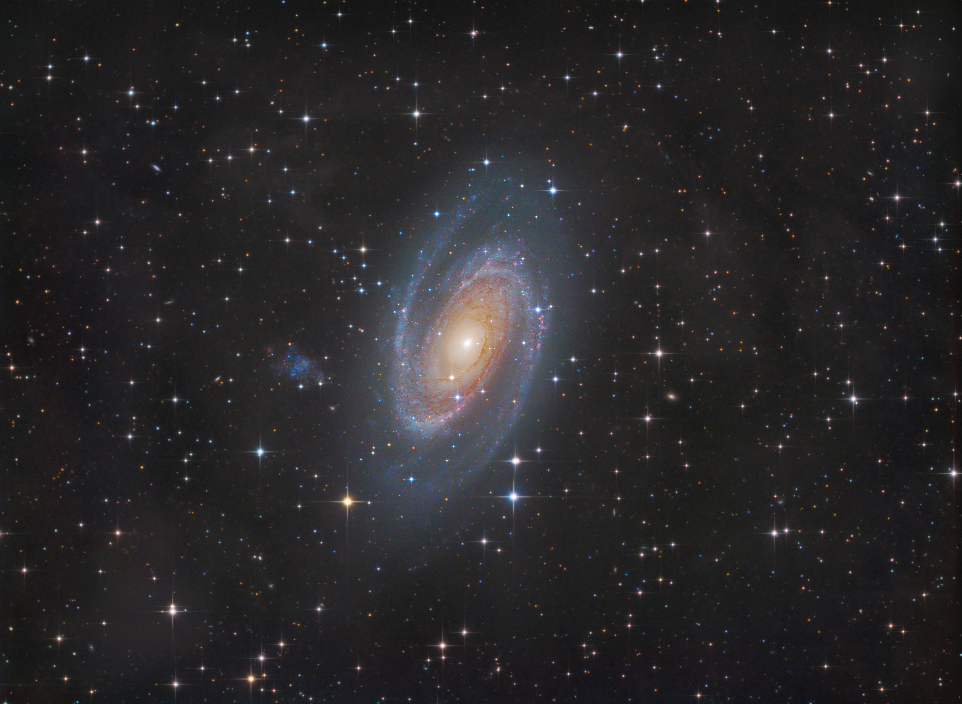 Messier 81 ist eine Spiralgalaxie im Sternbild Großer Bär. Sie liegt rund zwölf Millionen Lichtjahre entfernt und hat einen scheinbaren Durchmesser von 26,9 x 14,1 Bogenminuten. Mit im Bild befindet sich die irreguläre Zwerggalaxie Holmberg IX mit den HII-Regionen MH 9/10. Die Gegend um M 81 ist gefüllt mit schwachen Nebeln. Sie gehören zu unserer eigenen Galaxie und werden als galaktischer Zirrus bezeichnet. Weitere Informationen und Bilder: http://galaxyphoto.de/de/m081-de/