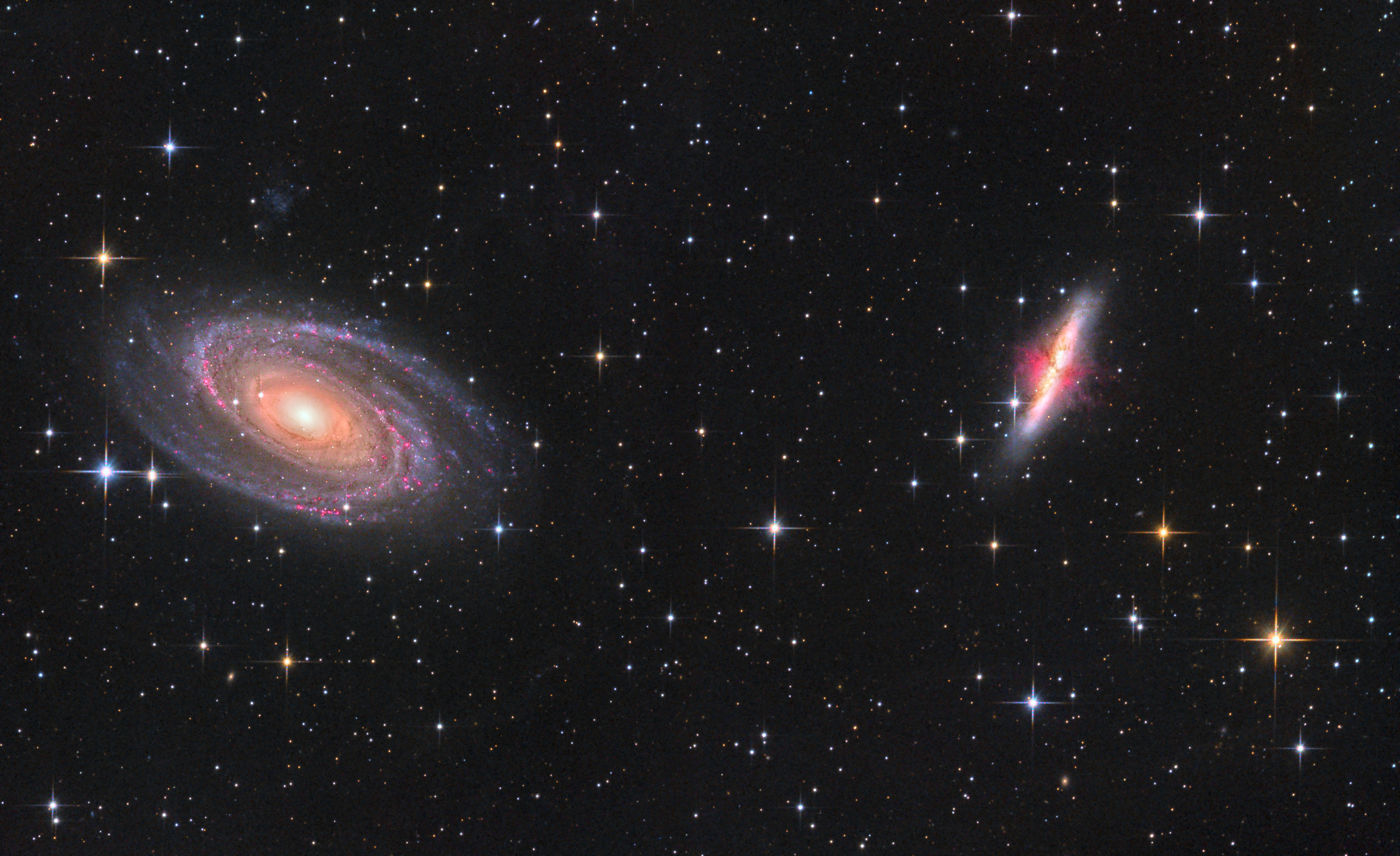 Bode- und Zigarren-Galaxien: eine H-Alpha-LRGB-Kombination. Weitere Infos: https://www.peterkurucz.com/the-m81-galaxy-group-first-light