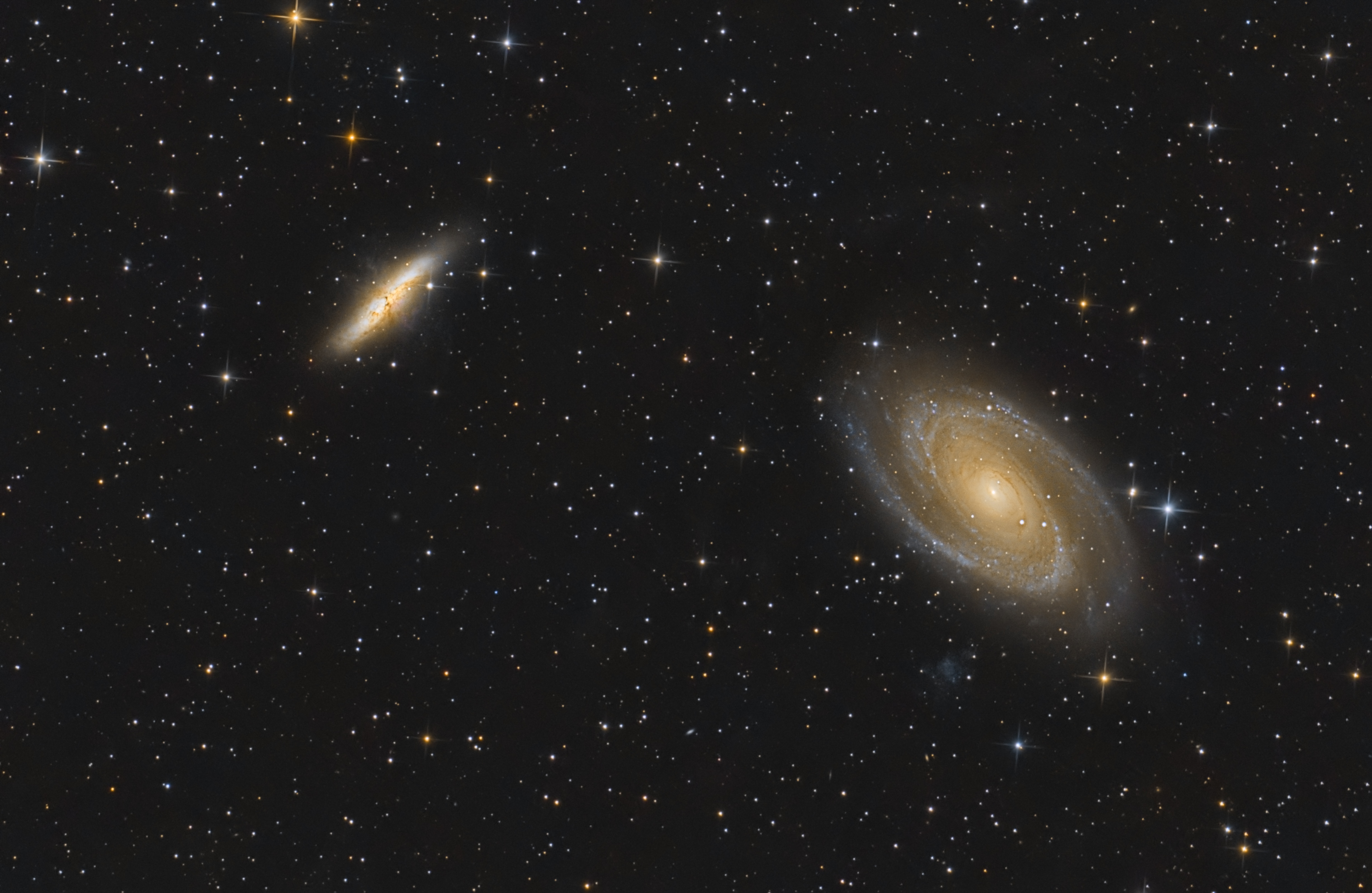 Ein tolles Galaxienpaar bei dunklem Himmel, in den österreichischen Alpen fotografiert. Leider kann meine unmodifizierte Nikon D5100 die roten Bereiche der M82 nicht abbilden.