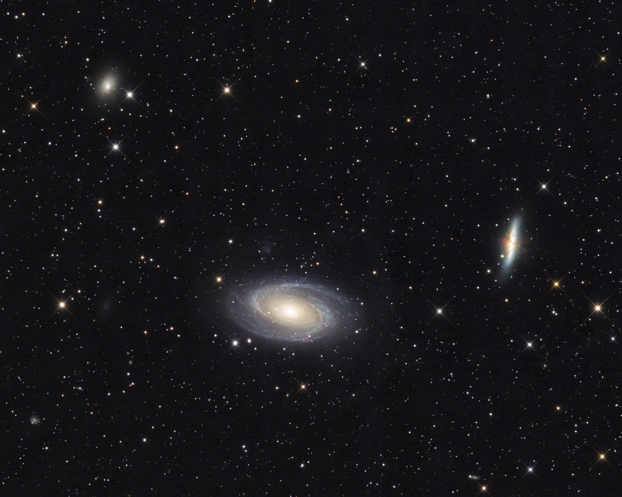 Messier 81 zählt ebenso zu den Highlights des Frühjahrs. Umgeben von IFN, der sich aber nur mit sehr viel Belichtungszeit darstellen lässt, sind Messier 81, Messier 82 und NGC 3077 die prominentesten Vertreter der M81-Gruppe. Man kann davon ausgehen, dass diese und viele weitere kleinere Galaxien durch Gravitationskräfte aneinander gebunden sind.