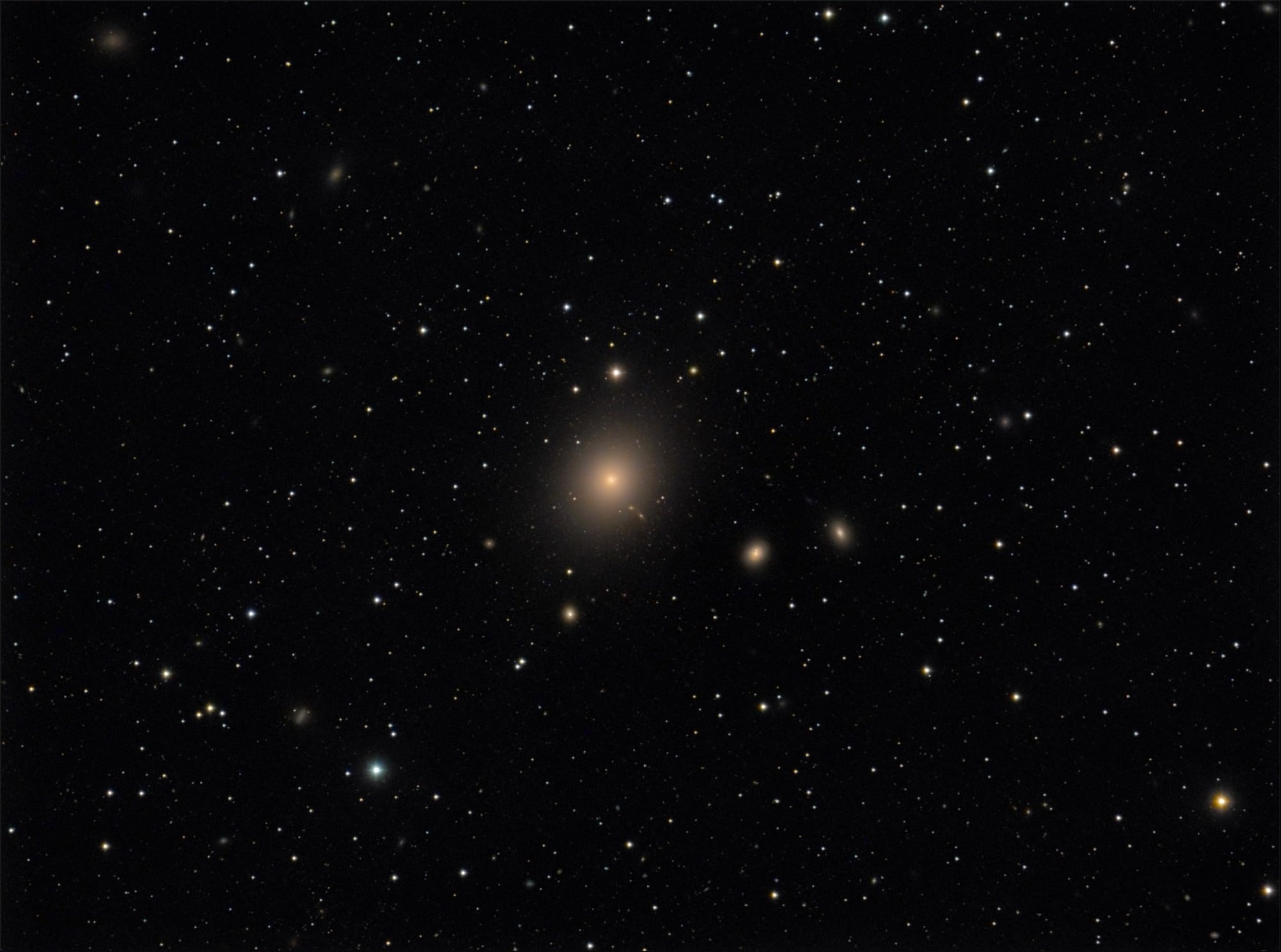 Messier 87 ist das Schwergewicht im Virgo-Galaxienhaufen. Die sonst fehlenden Strukturen hebt die elliptische Riesen-Galaxie mir einer Fülle von Details auf, die sich erst bei längerem Hinsehen erschließen: Ein ganzer Schwarm von Kugelsternhaufen umgibt sie und hinzu kommen viele kleinere Satellitengalaxien. M 87 ist ein Hingucker auf ihre Weise!