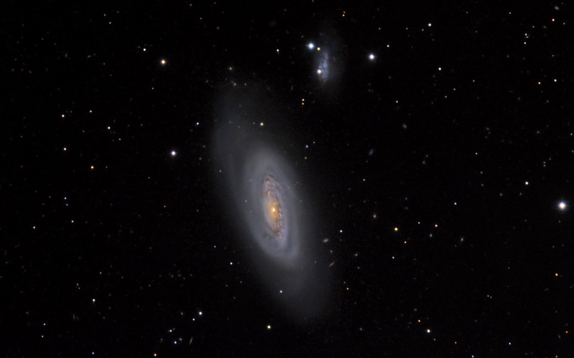In drei Nächten haben wir die Galaxie M 90 im Luminanz-Kanal und in RGB tief ablichten können. Dabei wird nicht nur die Struktur in der Spiralgalaxie selbst deutlich, sondern auch das Zusammenspiel mit der nahen Zwerggalaxie IC 3538. Viele weit entfernte Objekte finden sich im Hintergrund der Aufnahme.