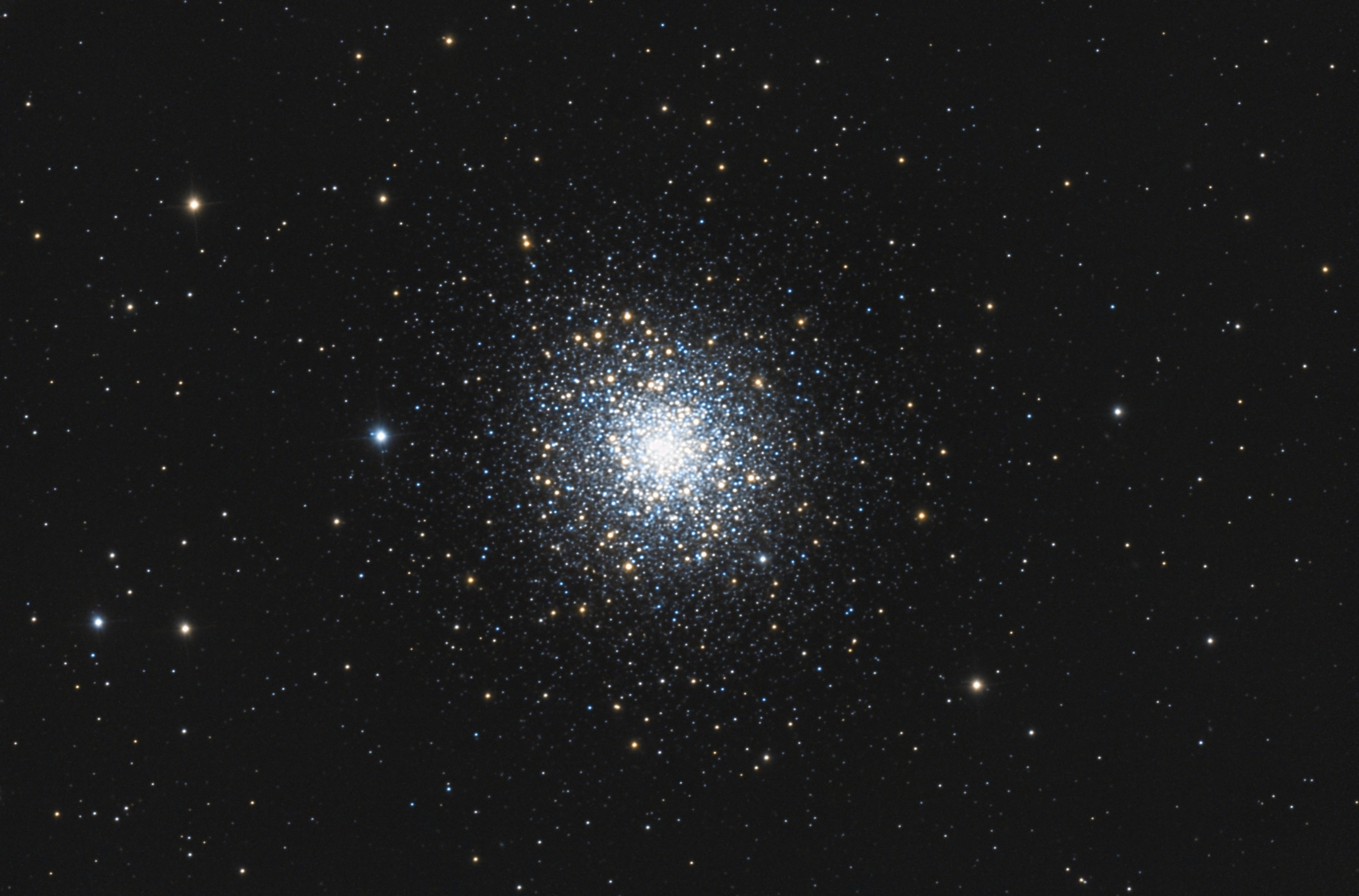 Kugelsternhaufen können sehr schöne und faszinierende Objekte sein. Messier 92 bietet sich hier sehr gut an für ein Instrument mit größerer Brennweite. Leider waren die Aufnahmebedingungen nicht optimal; FWHM der Sterne nur 3.0".