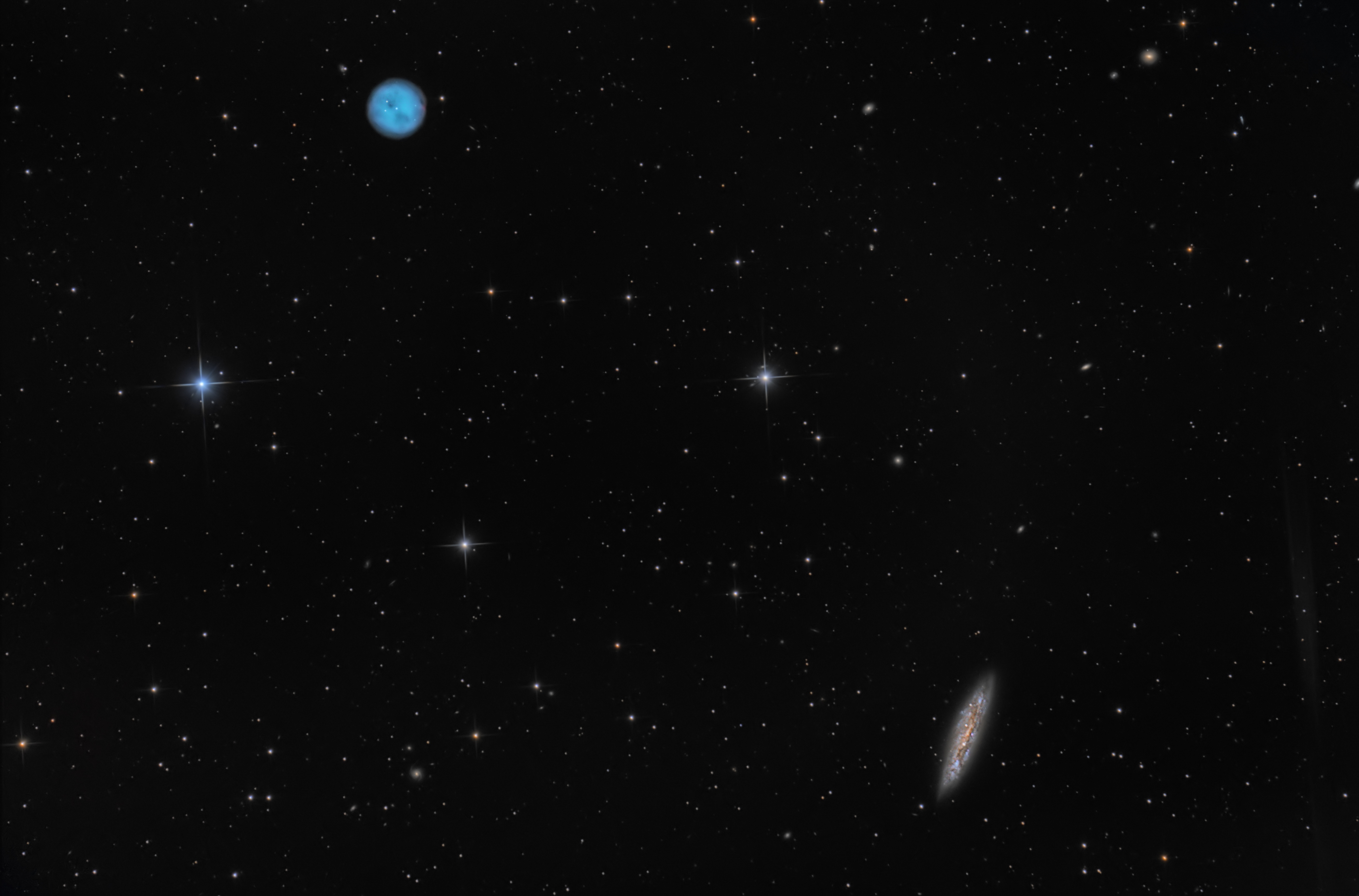 Direkt am Großen Wagen sind gleich zwei tolle Objekte nebeneinander. Da ist zum einen der planetarische Nebel mit dem Namen Eulennebel (M97) und zum anderen M108, eine Spiralgalaxie, die von der Seite gesehen wird.