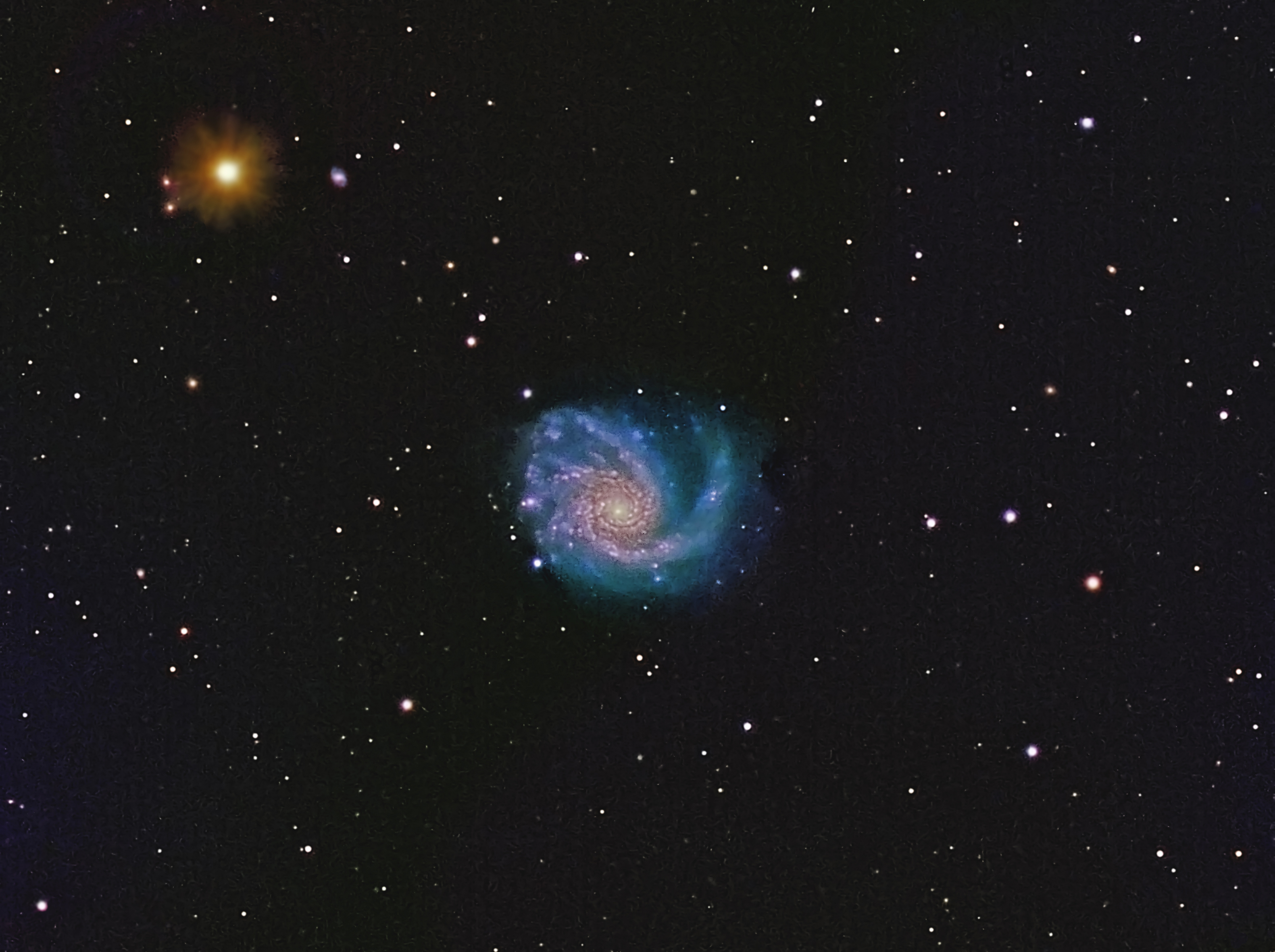 Messier 99 ist eine Spiralgalaxie im Sternbild Haar der Berenike. Der helle Stern HD 107170 (SAO 100039) hat die für den Spektraltyp K typisch orange Farbe. Dieses war auf Grund der immer kürzer werdende Nächte meine letzte Deep-Sky-Aufnahme vor der Sommerpause.