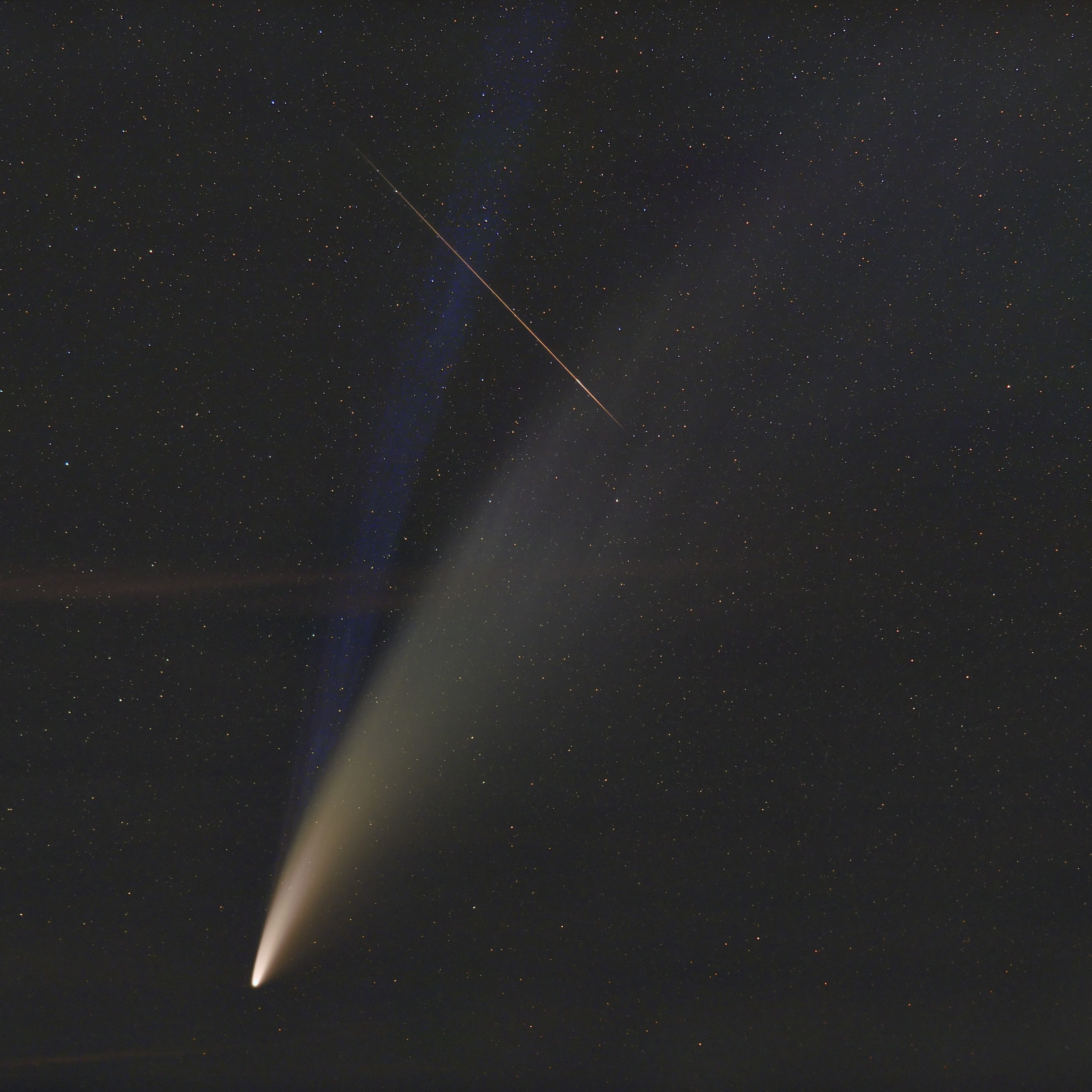 Dieser sporadische Meteor kreuzte den Schweif des Kometen am 13. Juli 2020 um 00:10 Uhr. Um die Einzelaufnahme (3 Sekunden) bei hoher ISO-Zahl zu verbessern, wurden 25 Drei-Sekunden-Aufnahmen kombiniert.