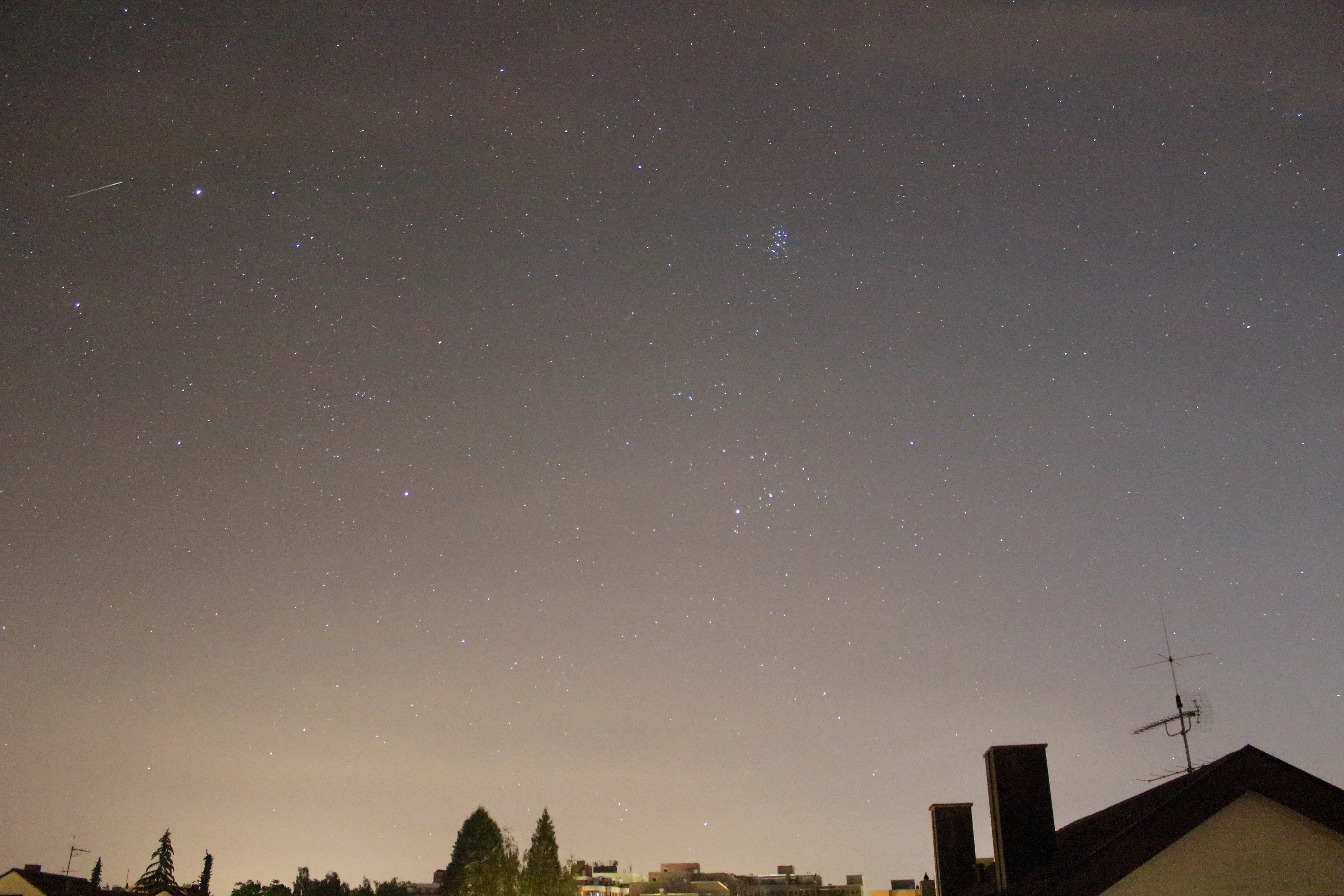 Dieses Bild zeigt die Spur eines Flugzeugs (nahe Zeta Tauri) und eines Meteors, der vor Theta Tauri vorbeizog.
