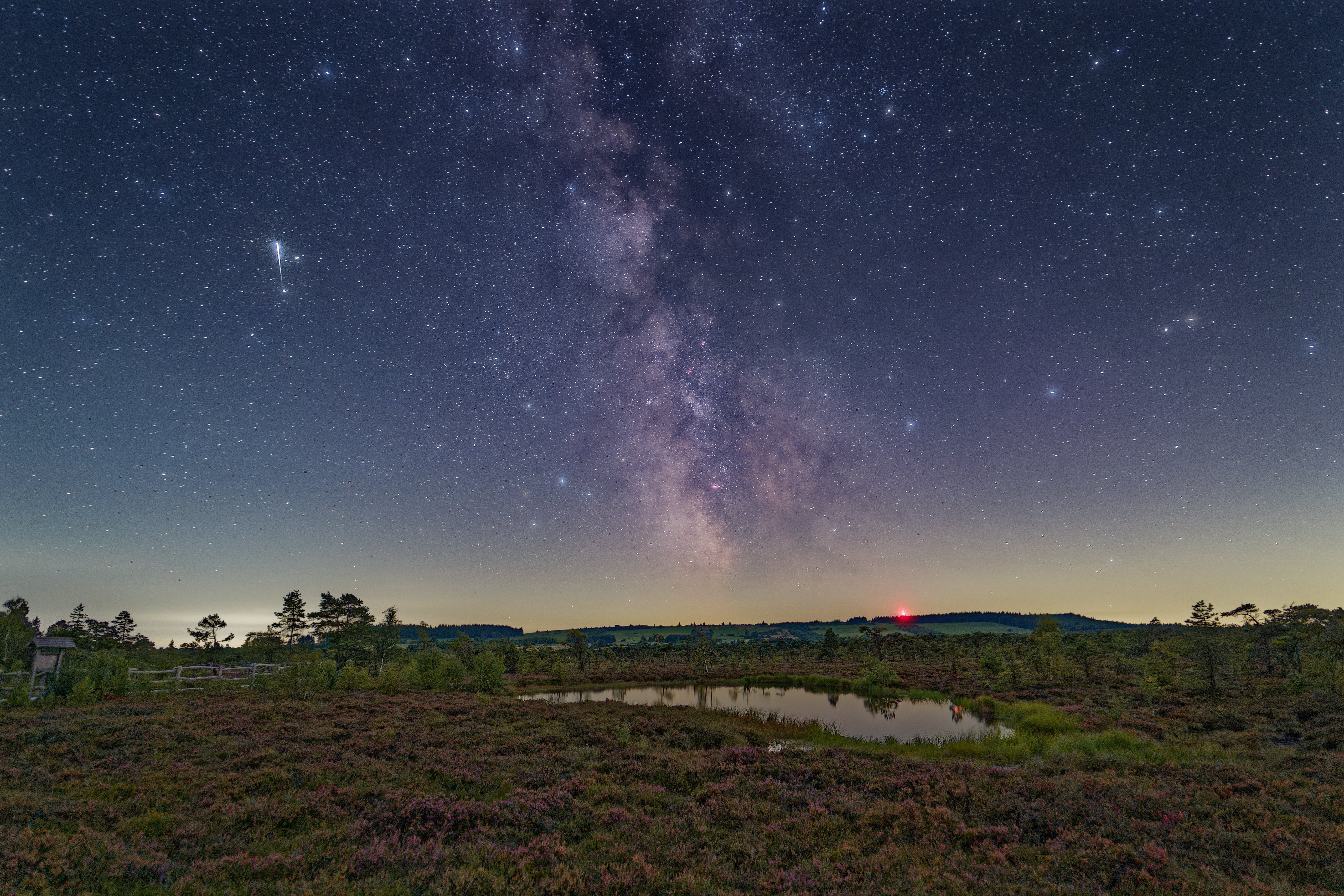 Das vorliegende Bild zeigt die Milchstraße und einen zufällig eingefangenen Meteor über dem Moorauge des Schwarzen Moors in der Rhön. Ich hatte nur eine kompakte Systemkamera mit einem leichten Reisestativ im Einsatz; auf eine astronomische Montierung habe ich der Einfachheit halber bewusst verzichtet. Landschaft und Sternenhimmel habe ich separat belichtet. Bei der Belichtung des Sternenhimmels konnte ich mit Hilfe eines Diffusors vor dem Objektiv die Sterne deutlicher hervorheben. Während der Belichtungssequenz des Sternenhimmels erschien ein heller Meteor; diese um 21:56 Uhr entstandene Einzelbelichtung habe ich als Referenz für die Ausrichtung aller Einzelbilder gewählt.
