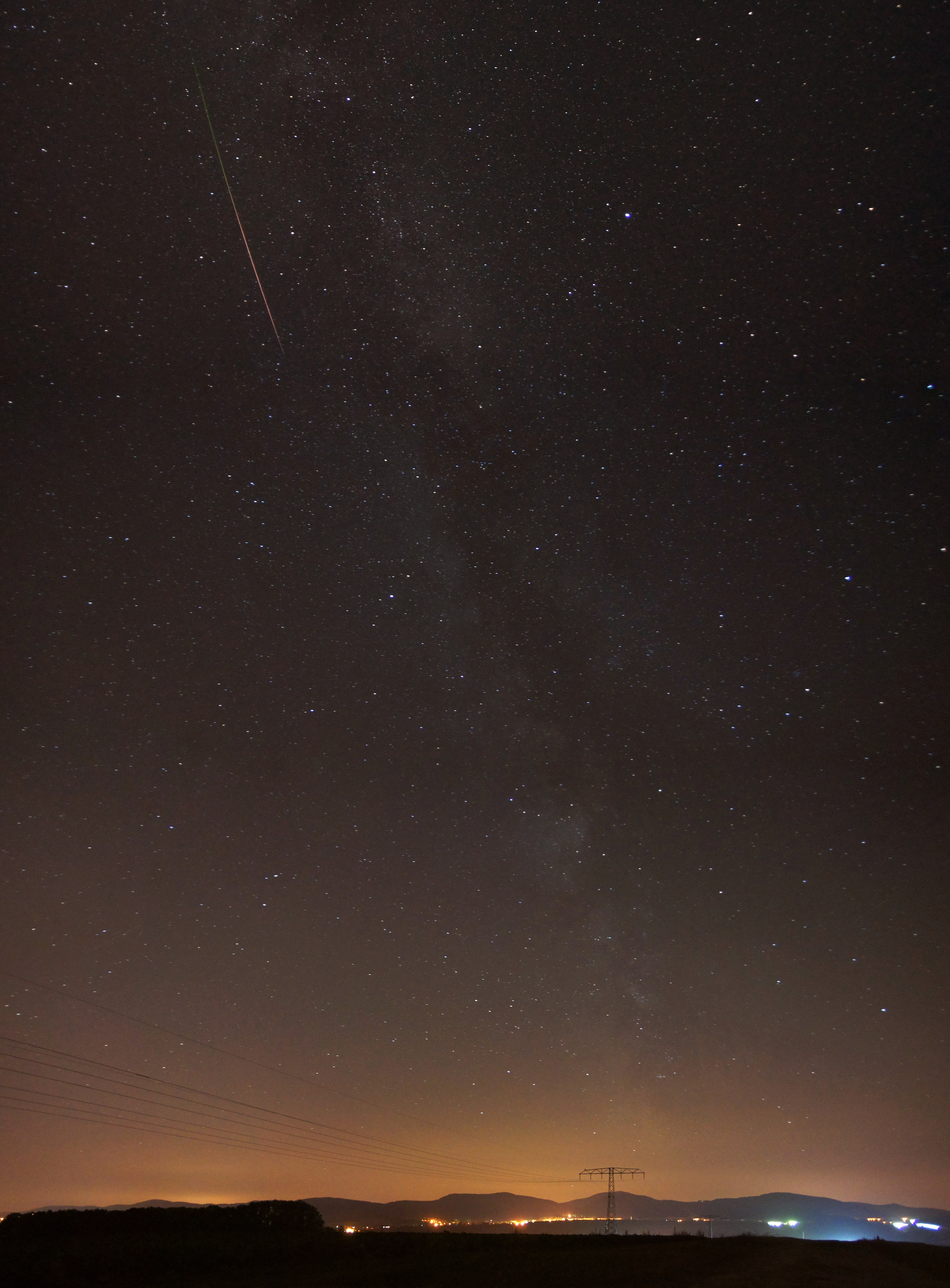 Auf dem Kummersberg bei Zittau habe ich heute Nacht zufällig einen Meteor erwischt, als er an der Milchstraße entlang schoss, und in ein Vierfach-Komposit eingefügt. Die Sternschnuppe war allerdings denkbar weit von Perseus entfernt.