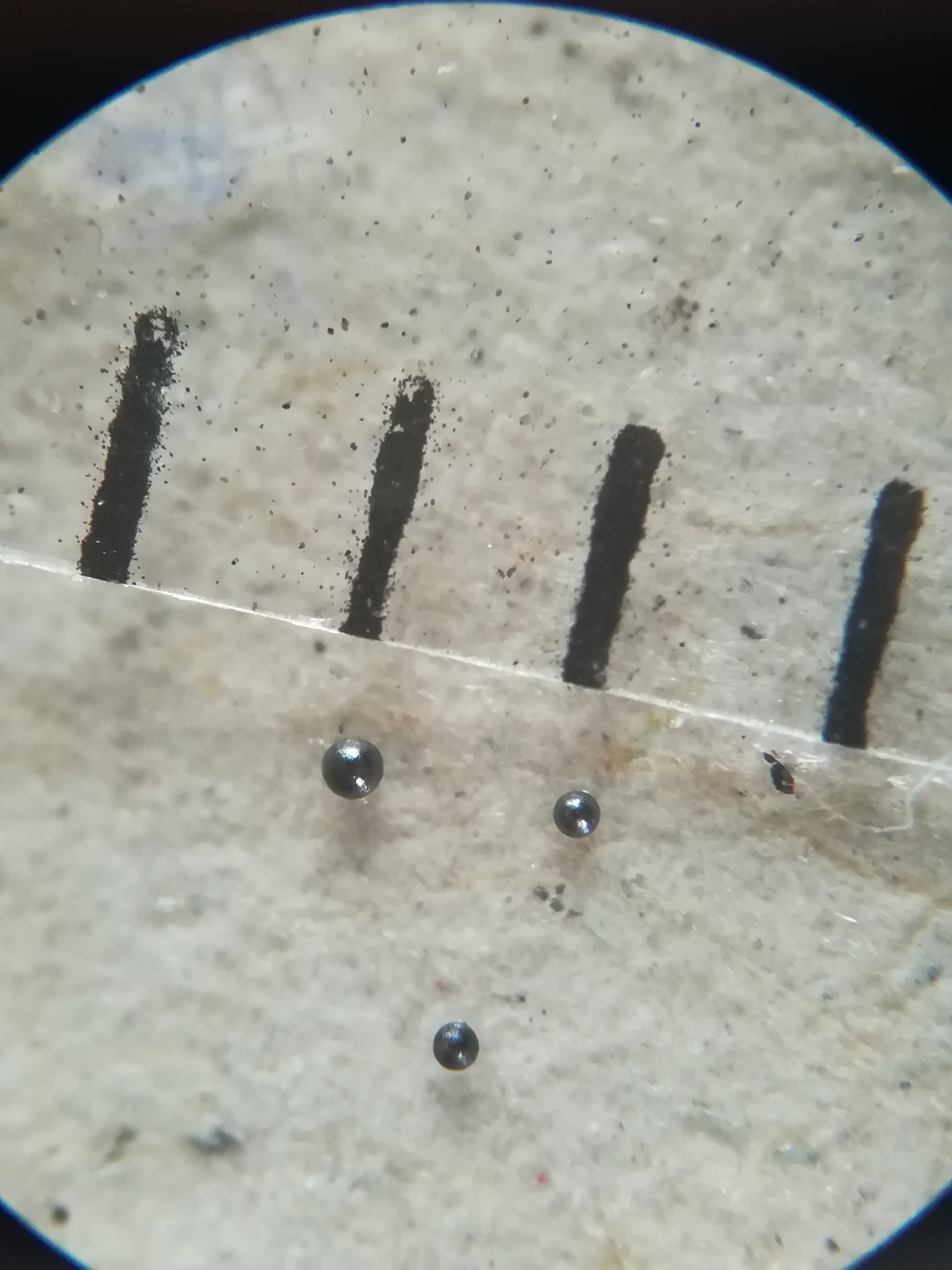 Angeregt von Artikeln über Mikrometeoriten habe ich meinen Regenrinneninhalt mit einem Magneten durchforstet, das Ergebnis waren nach einigem Suchen im sonstigen terrestrischen Abfall insgesamt drei kleine Mikrometeoriten, die ich auf Klebefilm fixiert habe, daneben eine selbstgedruckte Millimeterskala. Echtes Deep-Sky, irgendwo und irgendwann in einer Supernova entstanden. Faszinierend!