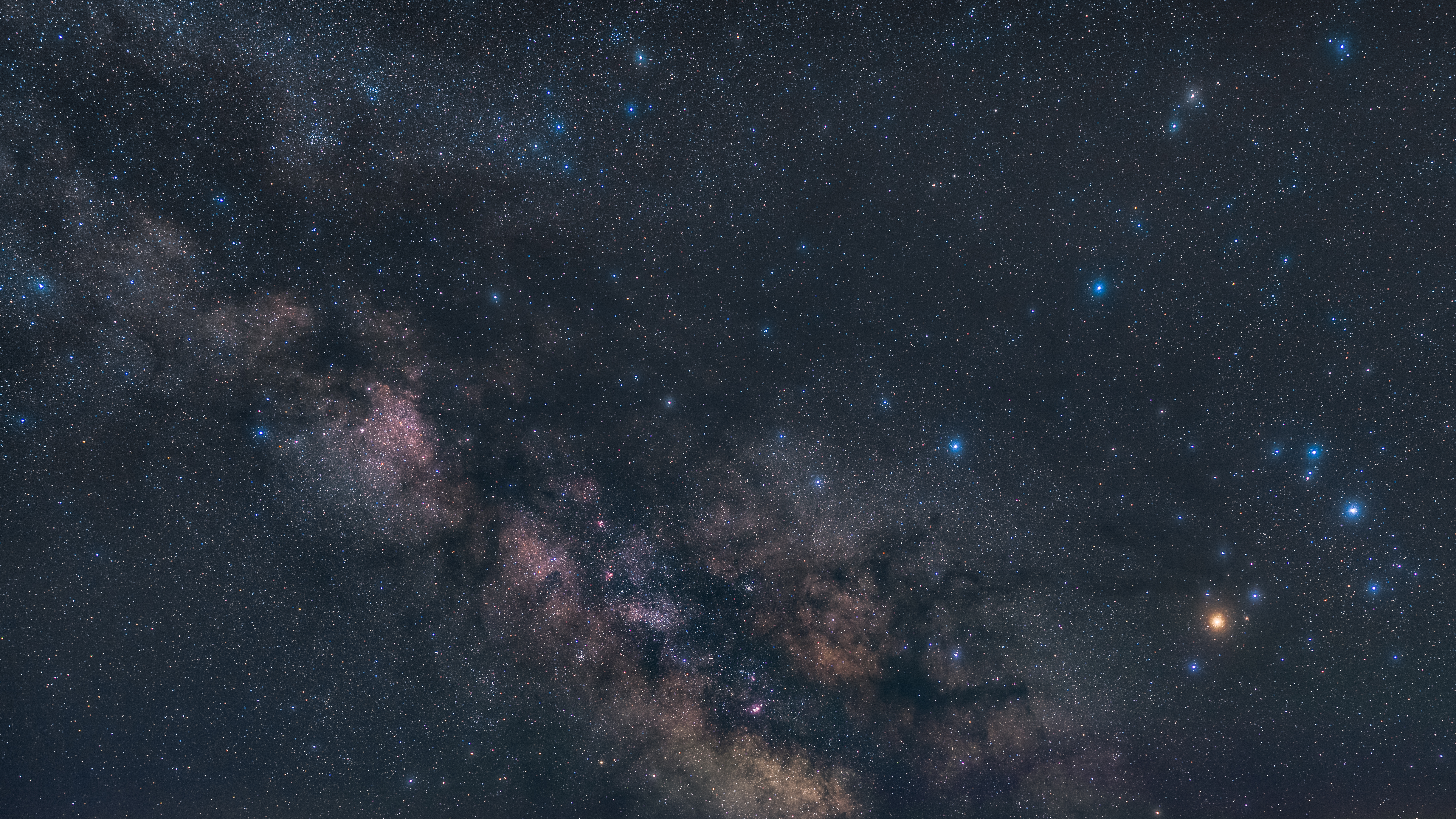 Zu sehen ist der Zentralbereichs der Milchstraße. Zu erkennen sind auch die Dunkelwolken nahe des auffällig hellen gelben Sterns Antares im rechten Bildbereich. Mit Hilfe eine Diffusors vor dem Objektiv konnte ich die Farben der hellen Sterne im Bild hervorheben.