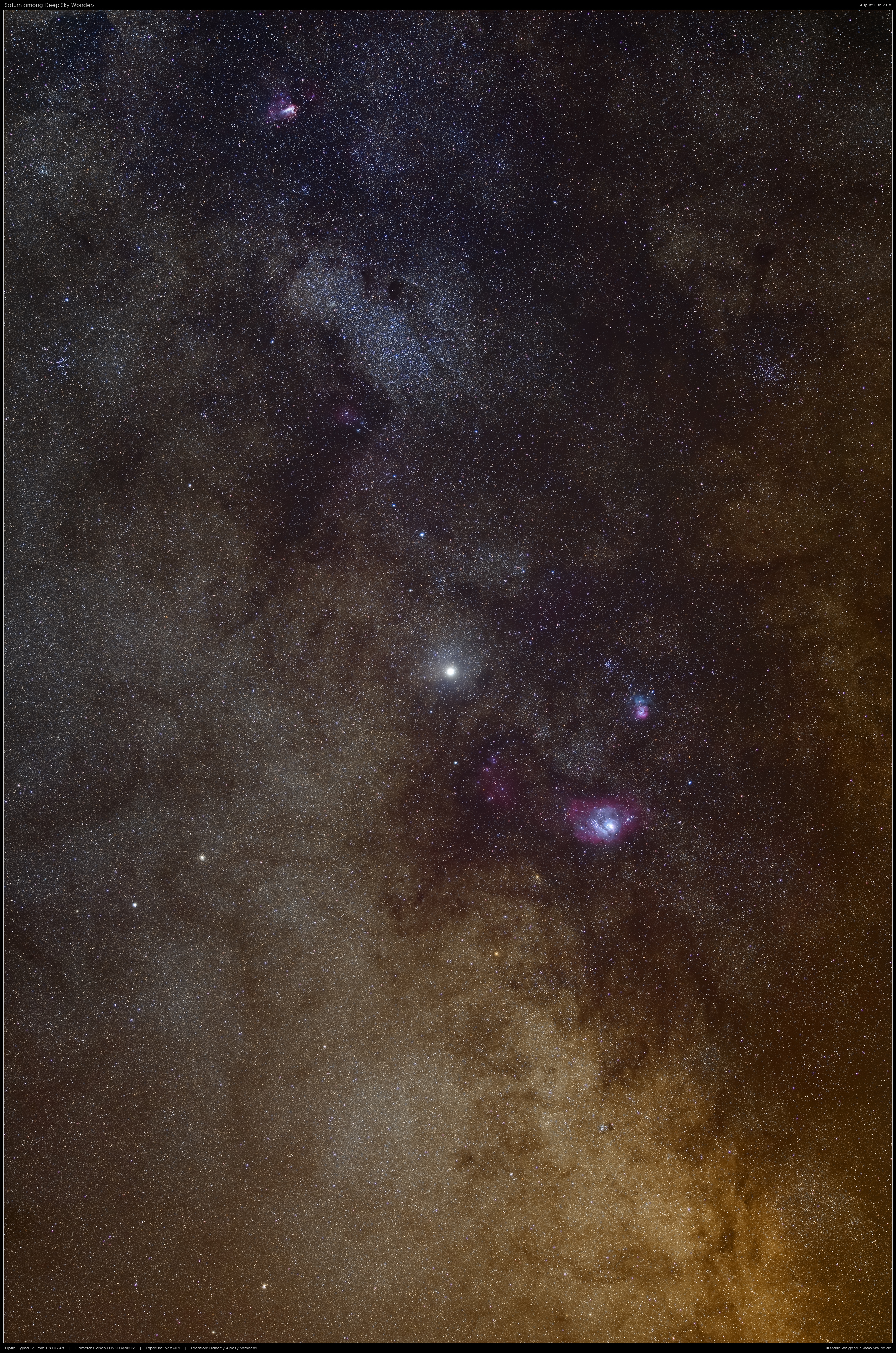 Derzeit hat eine der schönsten Regionen am Himmel Besuch vom Ringplaneten Saturn. Er ist dabei von einigen Deep-Sky-Highlights umgeben, darunter der Lagunennebel, Trifidnebel, die kleine und große Sagittarius-Sternwolke und einige Sternhaufen. Eine beschriftete Version des Bildes gibt es hier: http://www.skytrip.de/sag-4a.htm