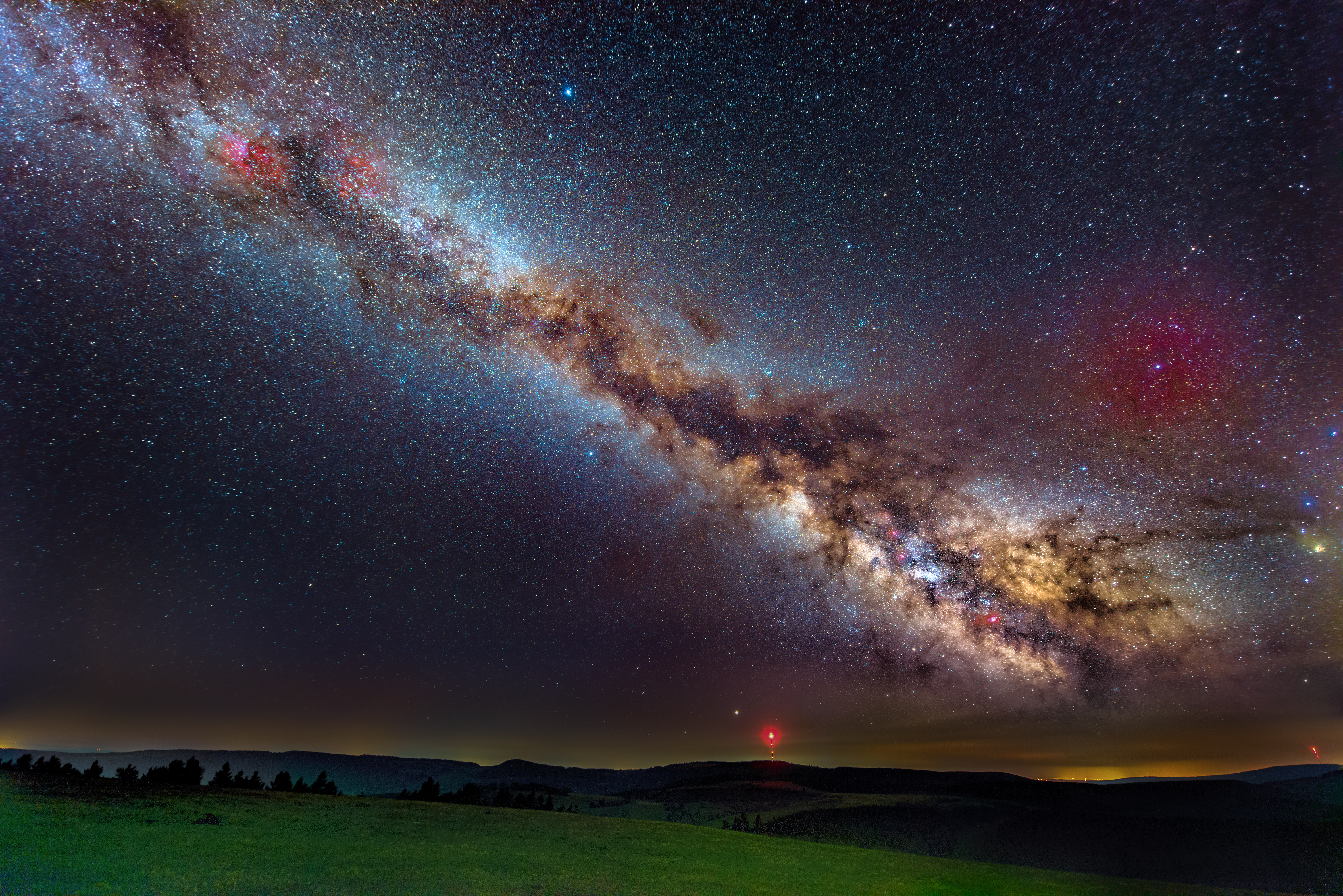 Milchstraße im Sternenpark Rhön vom 20. April 2020. Aufgenommen mit Nikon D810 und Nikkor 14-24 mm 2.8, Aufnahmedaten: 14 mm Brennweite bei Blende 2.8, ISO 6800, 149 x 15 sec. vom Fotostativ ohne Nachführung. Bearbeitet mit Sequator und Photoshop.