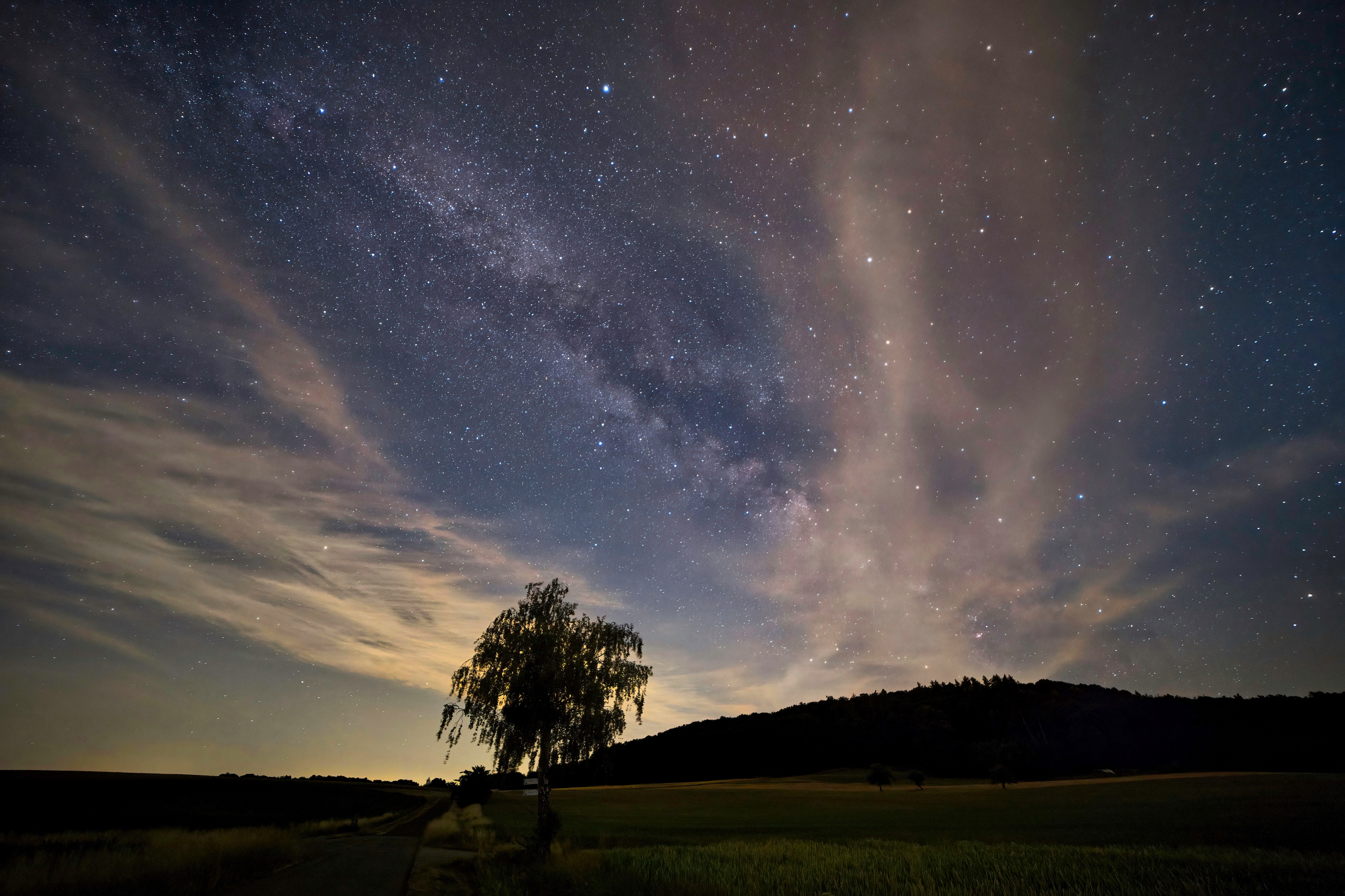 Die Milchstraße versteckt sich hinter Schleierwolken. Aufgenommen im Juli im Steigerwald bei dunklem Landhimmel.