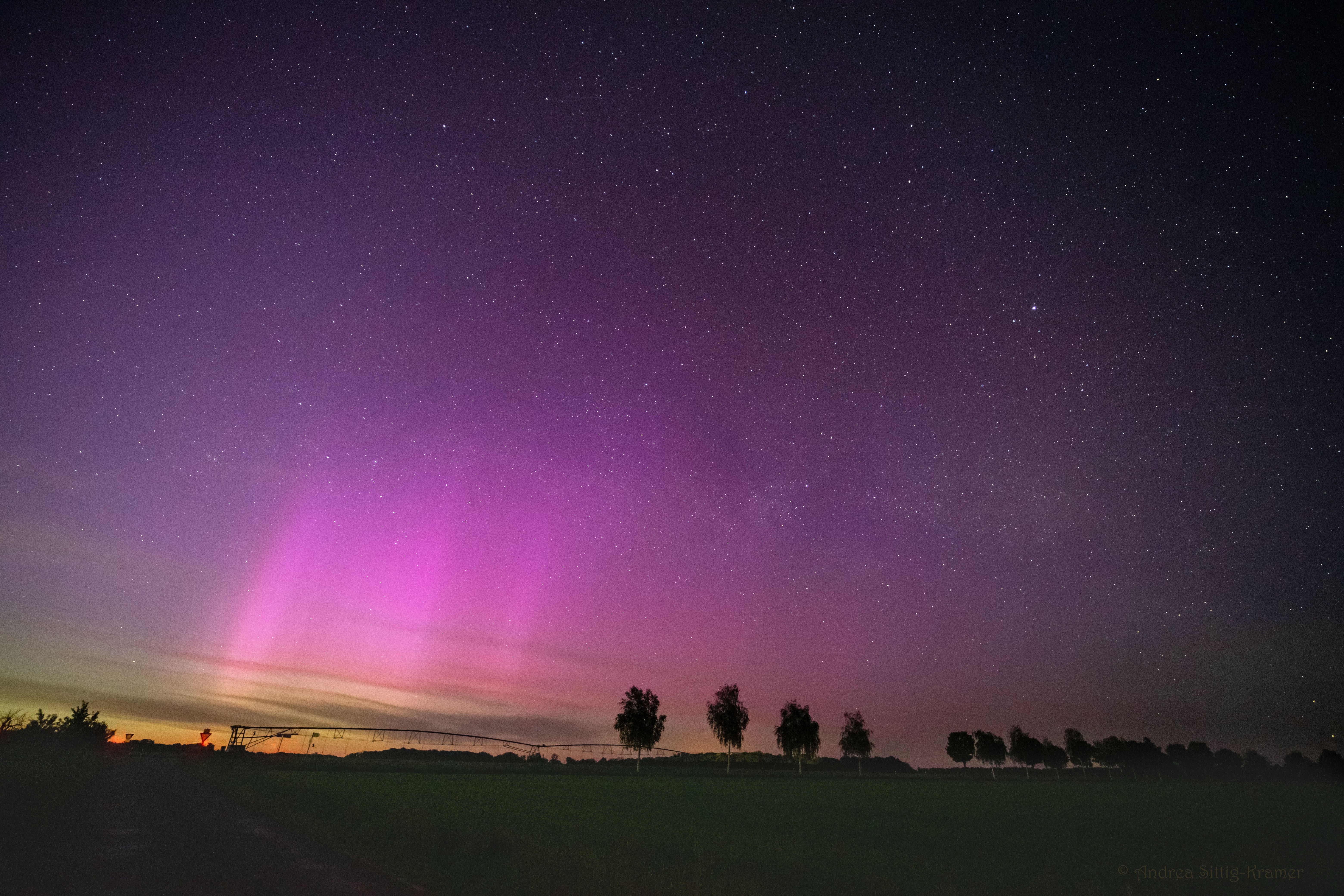 Nach der spektakulären Polarlichtnacht vom 10./11. Mai 2024 suchte ich mir am folgenden Abend einen dunklen Standort im Landkreis Uelzen mit guter Sicht zum nördlichen Horizont - in der Hoffnung auf weitere eindrucksvolle Beobachtungen. Ich positionierte meine Kamera zwischen Feldern an einer mit Bäumen gesäumten Landstraße. Um kurz nach 23 Uhr konnte ich ganz schwach visuell Polarlichter am nord-östlichen Himmel erkennen. Ein Probefoto bestätigte mir meine Beobachtung. Während am gestrigen Abend der gesamte Himmel in pinkem Licht leuchtete, waren die Farben der Aurora an diesem Abend nur in einen relativ kleinen, abgegrenzten Bereich im und unter dem Sternbild Kassiopeia (fast) nur fotografisch sichtbar. Auch die Beobachtungszeit war sehr begrenzt. Nach einer knappen halben Stunde war der zarte Zauber vorbei. Schemenhaft erkennt man im Polarlicht den Bogen der Milchstraße. Dieser geht über in den rechten, dunkleren Bereich des Himmels mit dem Schwan und Adler (am Horizont ganz rechts unten). In der oberen rechten Bildmitte strahlt hell die Vega in der Leier – darüber der wunderschöne dunkle Uelzener Landhimmel.