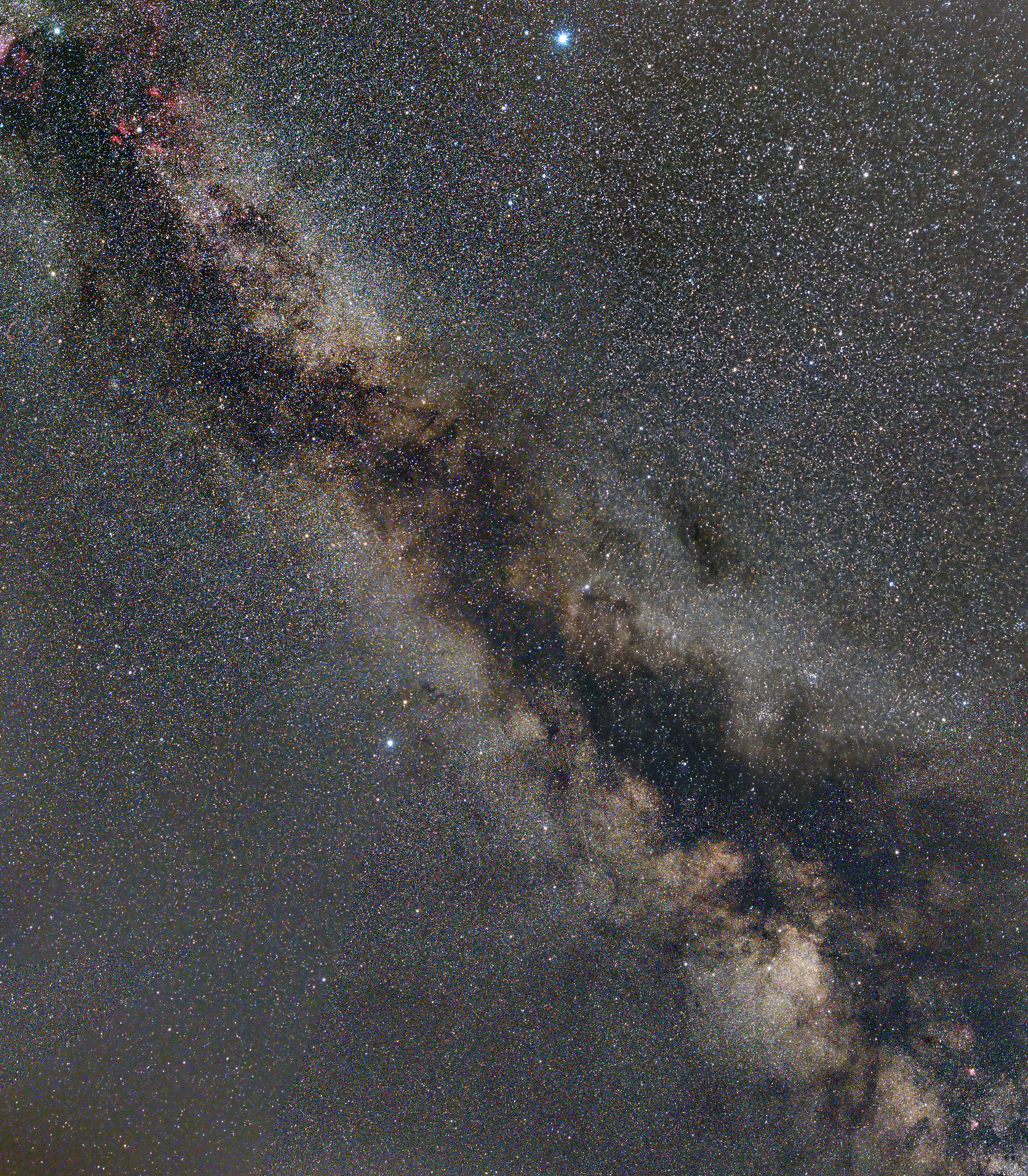 Schon lange wollte ich die Milchstraße von meiner Sternwarte in der Lüneburger Heide im Frühsommer aufnehmen. In der Ersten Mai-Dekade waren die Bedingungen ideal: Sehr gute Durchsicht, geringe Luftfeuchtigkeit (etwa 20 Prozent) und noch dunkler Himmel bis zu 21,8 mag (gemessen mit dem SQM-L). Zudem kam das neue Sigma-Objektiv 24 mm, 1:1,4 zum Einsatz, mit dem vier 10er Serien in drei Nächten mit f-5 an einer modf. 600Da belichtet wurden. Die Aufnahmefelder wurden dann zu einem Mosaik zusammengefügt.
