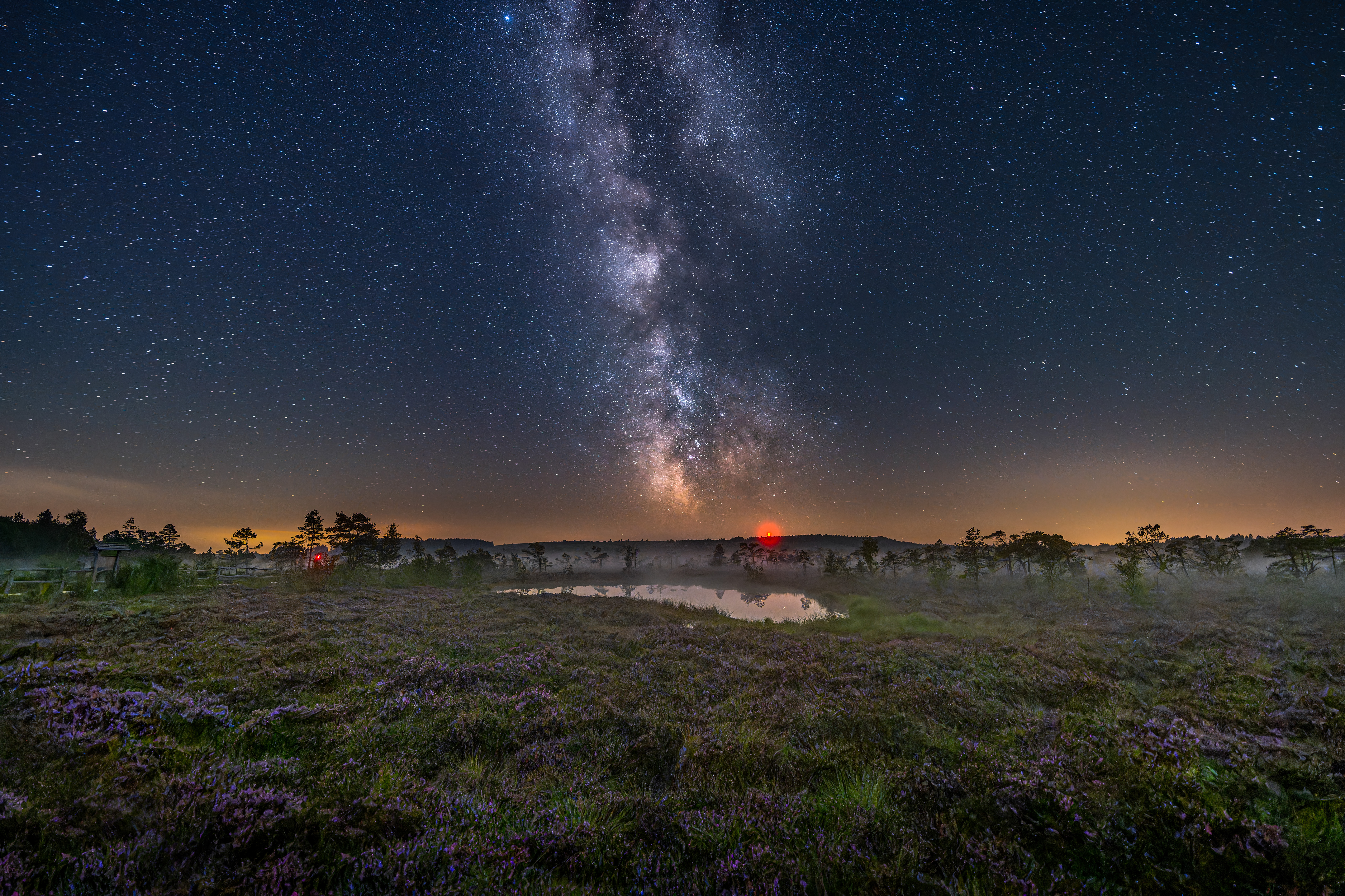 Milchstraße über dem Moorauge im Schwarzen Moor der Rhön, mit romantischer Nebelbildung. Sony A7iv mit Sony 14 mm f1,8, ISO 12800, 30 sec belichtet, Singleshot , entrauscht mit DXO Pure RAW und in Photoshop optimiert.