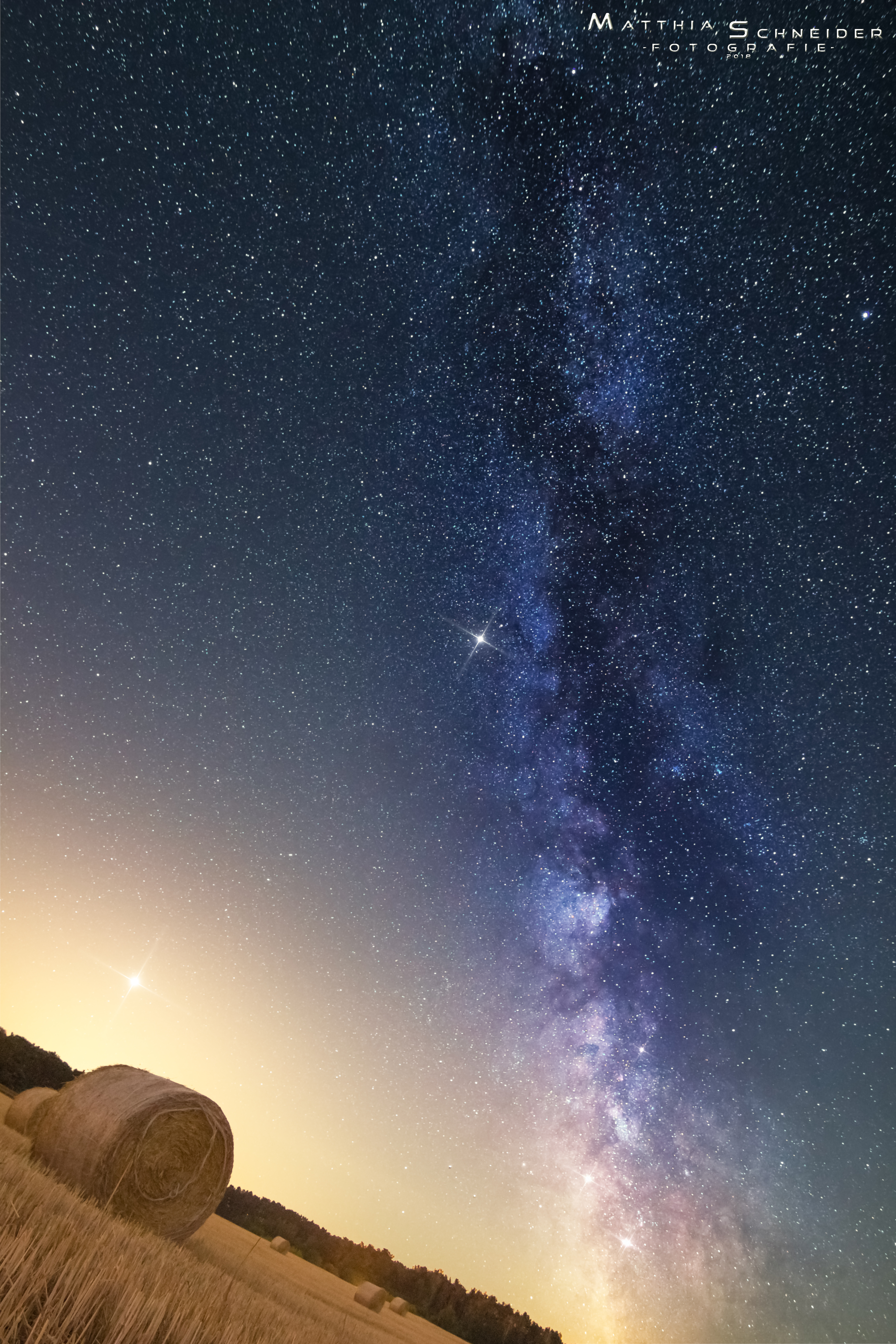 Auf der Suche nach einem Ort, der nicht allzufern ist, aber an dem die Lichtverschmutzung der Städt nicht so stark ist, fuhr ich in die Nähe von Reuden/Anhalt, um die Milchstraße über den gemähten Feldern festzuhalten. Trotz der relativen Entfernung zur nächstgrößeren Stadt (Richtung Süden) sieht man das Leuchten von der Stadt Dessau-Roßlau noch sehr gut (linker Bildabschnitt). Gleichzeitig leuchtet dort der Mars.