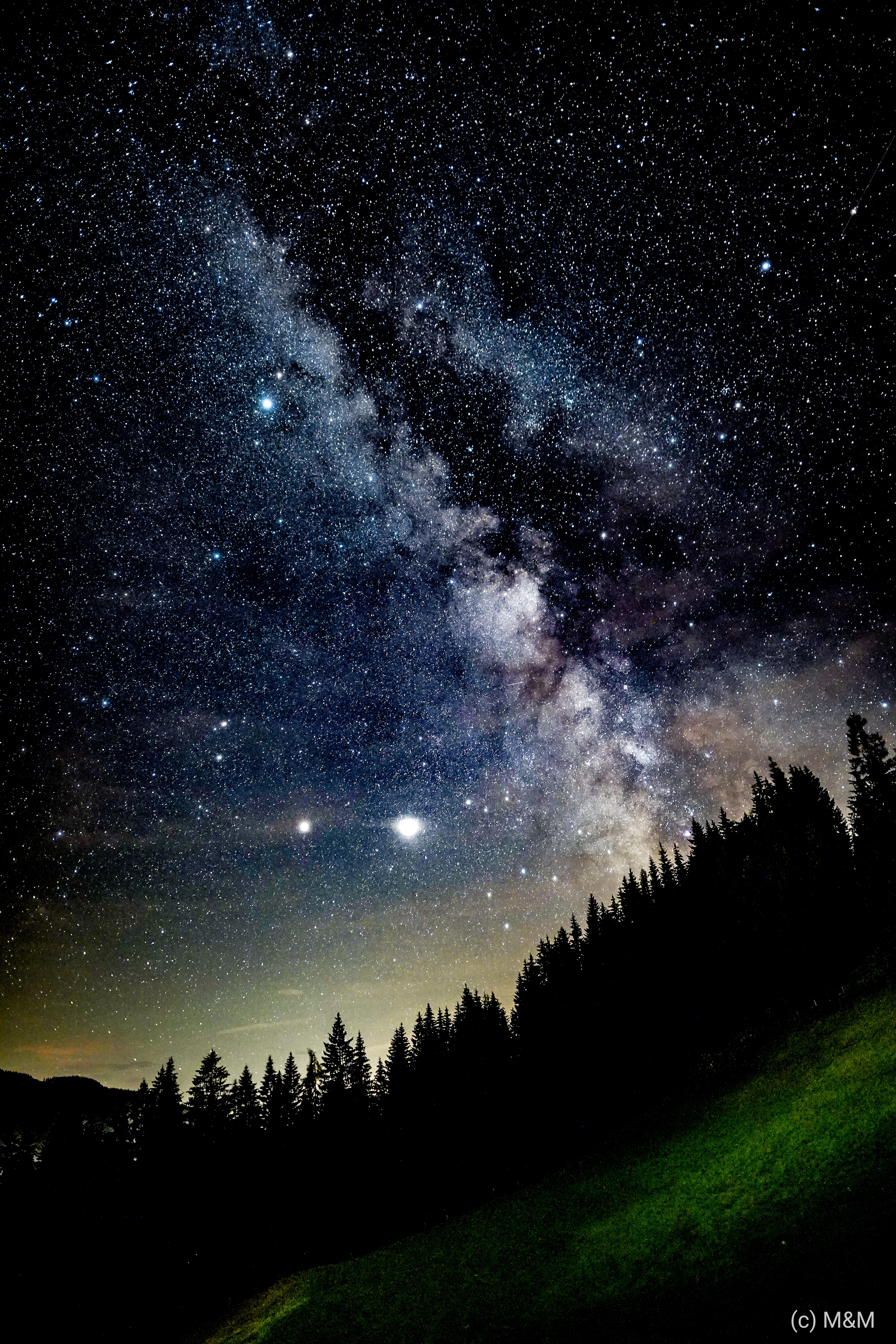 Liegend auf der Wiese neben der Alm und bei noch eingeschaltetem Terrassenlicht, welches die Wiese im Vordergrund beleuchtete, entstand dieses Foto mit 15 Sekunden Belichtung bei ISO 8000, F1.6 bei 20 mm als Singleshot. Jupiter und Saturn sind hell zu erkennen und in Kombination mit den Baumspitzen ein schönes Zusammenspiel