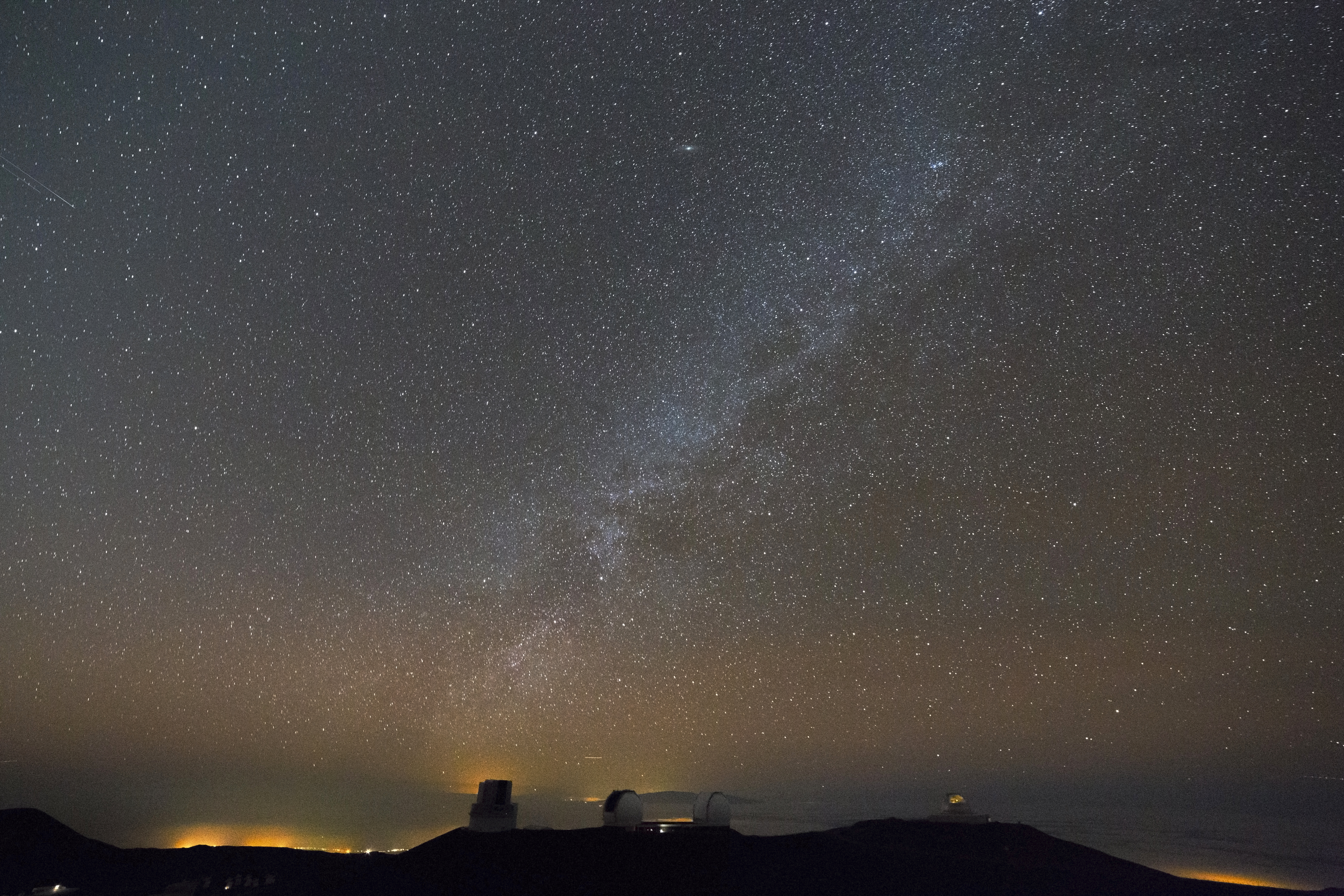 Über dem Subaru-Teleskop beginnt die Milchstraße mit dem untergehenden Schwan und erstreckt sich über Kepheus und Kassiopeia bis zum Perseus. Über den beiden Keck Teleskopen ist am oberen Bildrand M31 zu sehen. Gemeinsam mit den zwei hellen Sternhaufen h und chi Persei und dem schwach leuchtenden NASA IRTF entsteht ein hübsches Viereck aus irdischen Teleskopen und himmlischen Objekten.