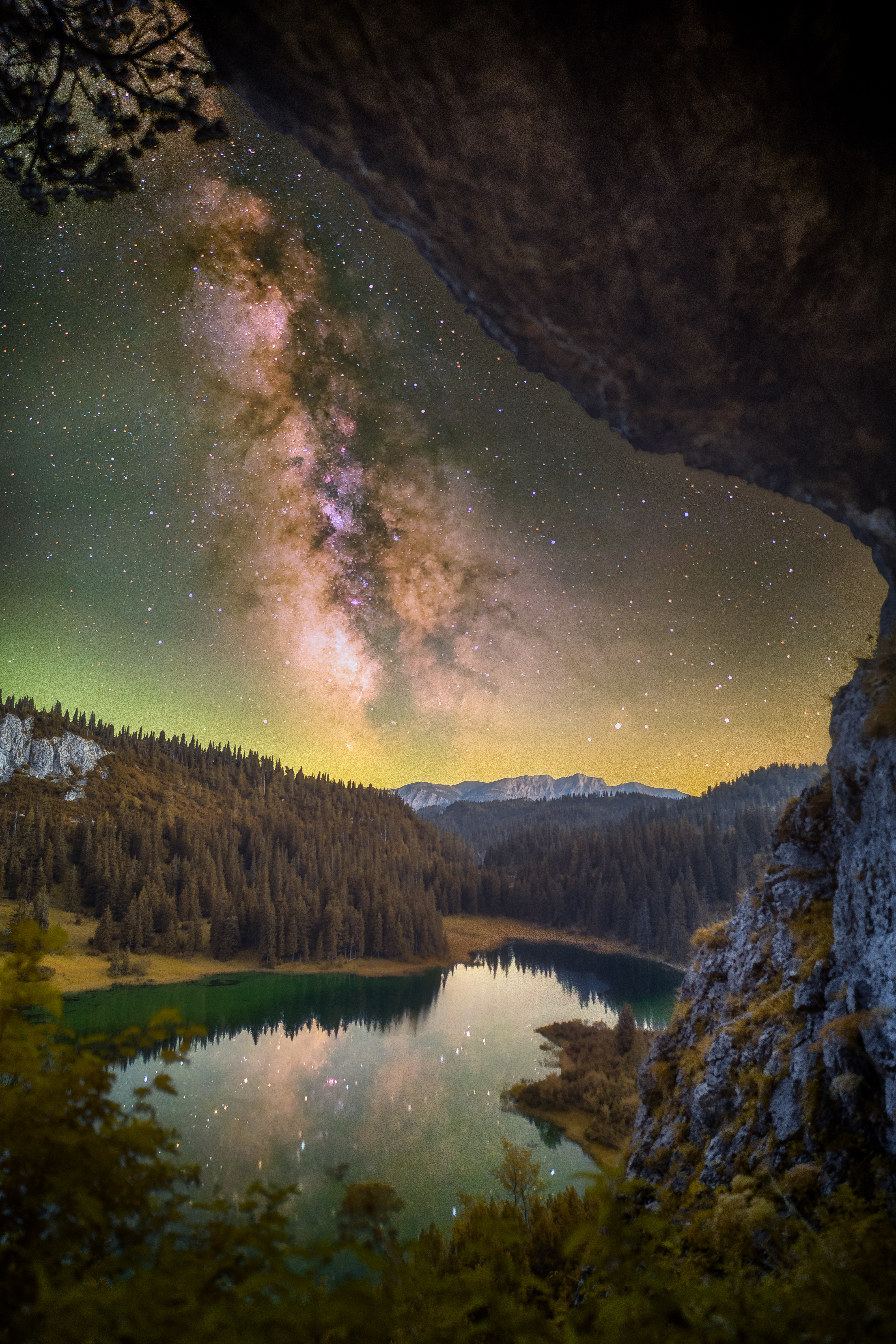 Aus einer Halbhöhle den Sackwiesensee im Hochschwabgebiet in der Region Hochsteiermark mit Milchstraße fotografiert.