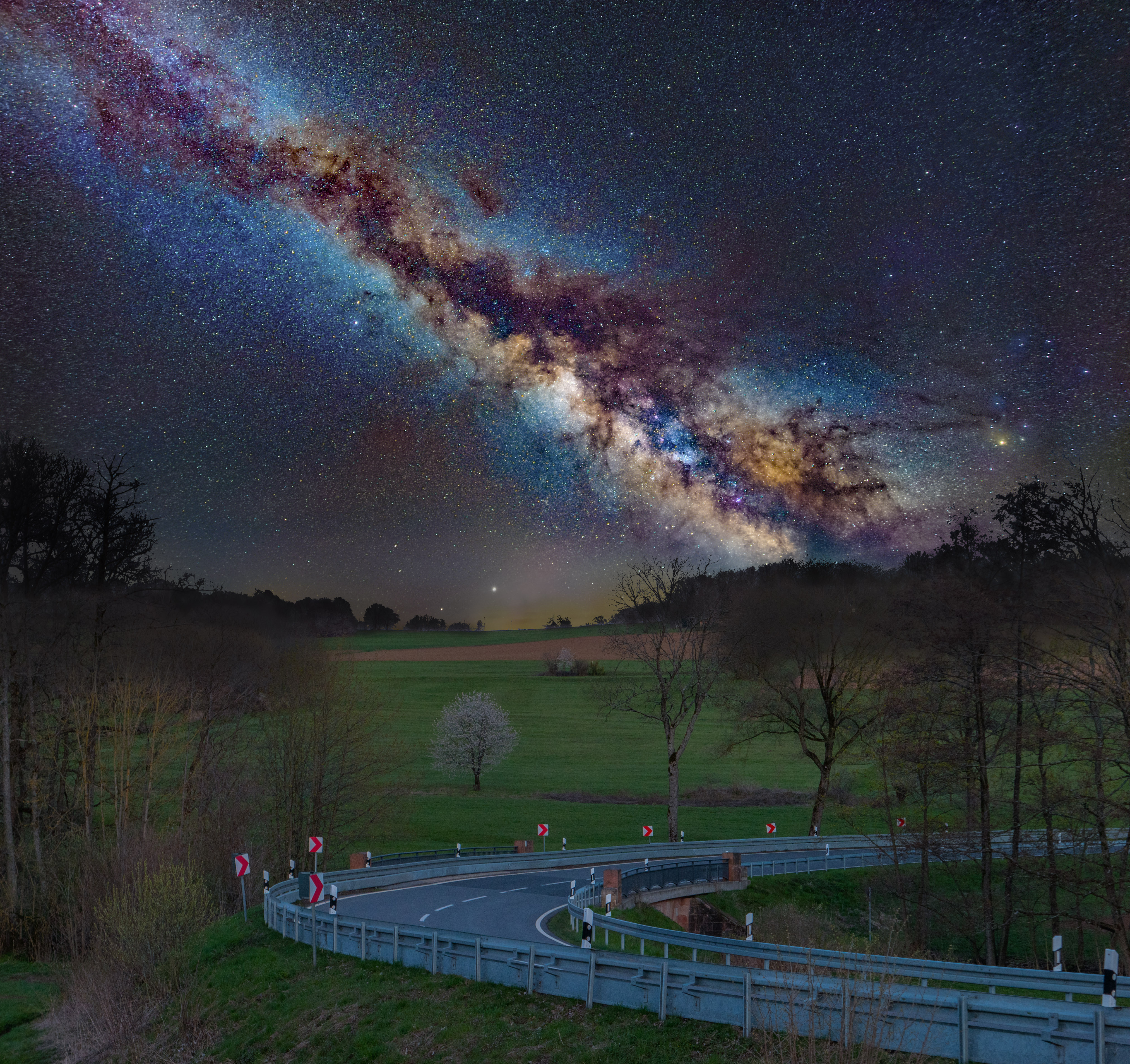 Leserbilder Astronomie: Milchstraße über Straßenkurve