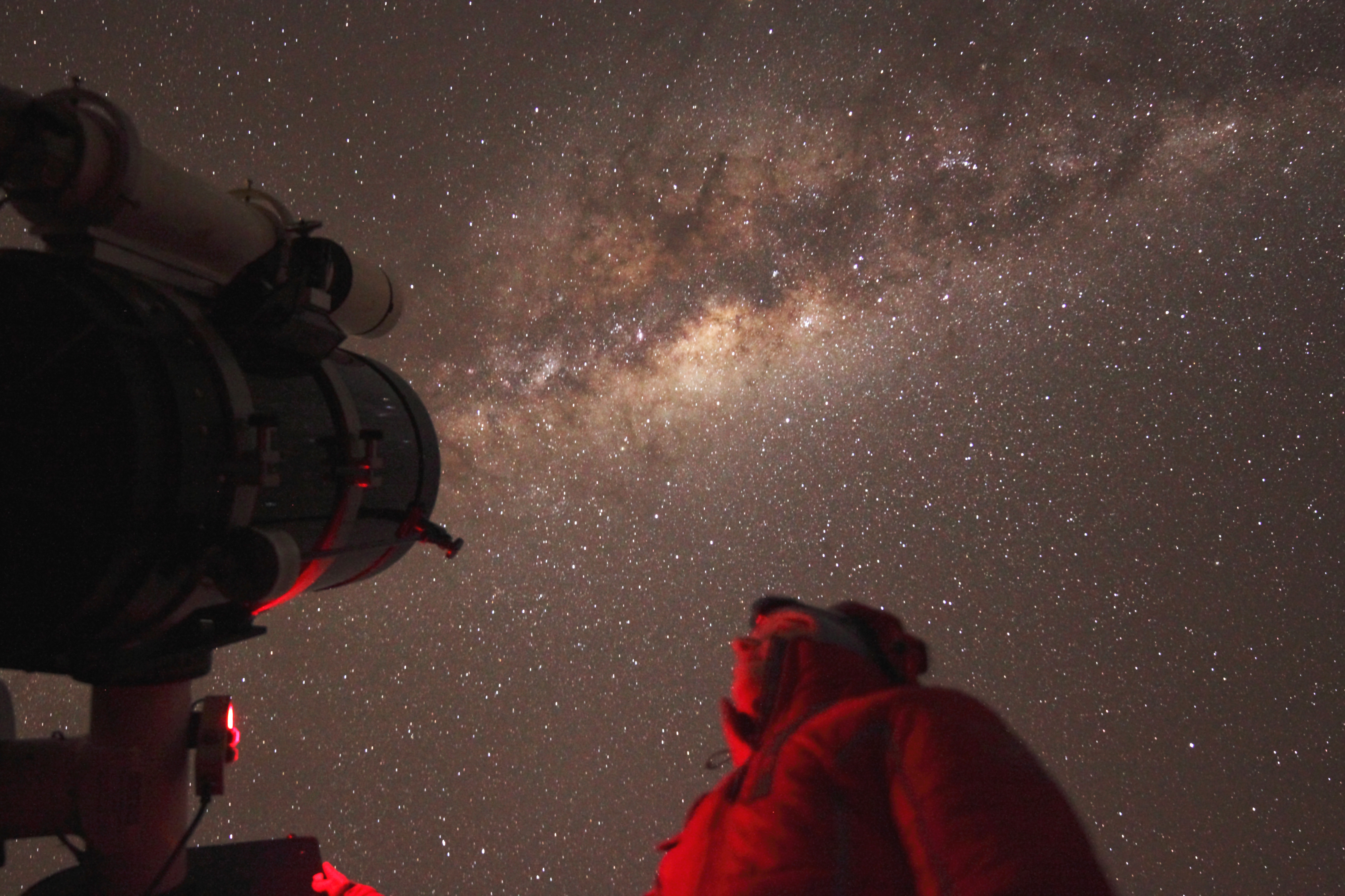 Das Bild wurde auf dem Dach der Cuno-Hoffmeister-Gedächtnis-Sternwarte von Sonja Itting-Enke in Windhoek, Namibia, gemacht. Es zeigt das C14 der Sternwarte und meine Frau, die den Himmel bewundert.