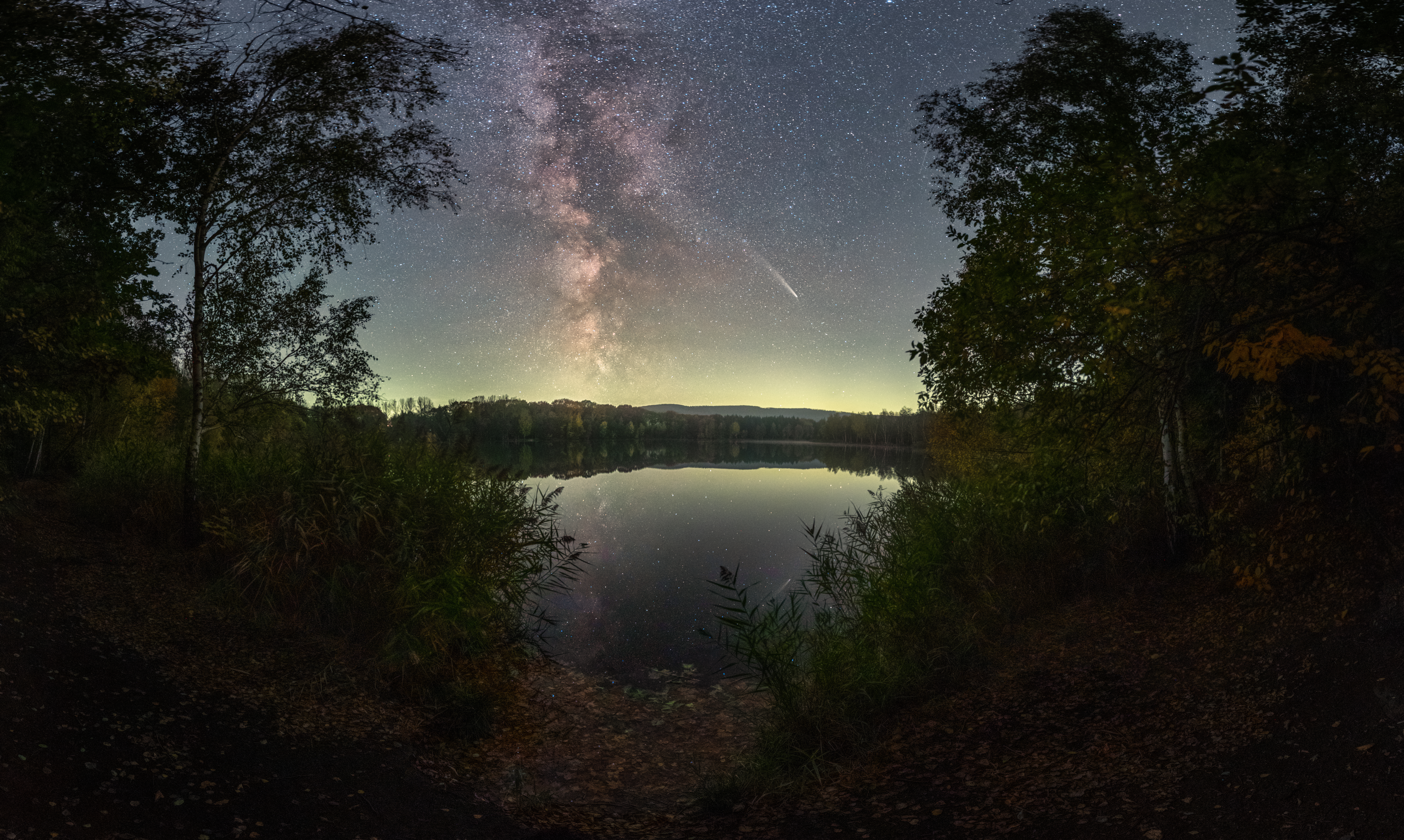 Komet Tsuchinshan-Atlas C/2023 A3 gegen 20 Uhr am westlichen Horizont über dem Bruchsee bei Duingen. Kurz nach der Dämmerung ist zu dieser Jahreszeit noch der markante Teil der Milchstraße sichtbar und zeichnet sich schön neben dem Kometen im Südwesten ab. Das Bild ist ein Ausschnitt eines 180-Grad-Panoramas, welches aus 5 Reihen und insgesamt 22 Bildern besteht.