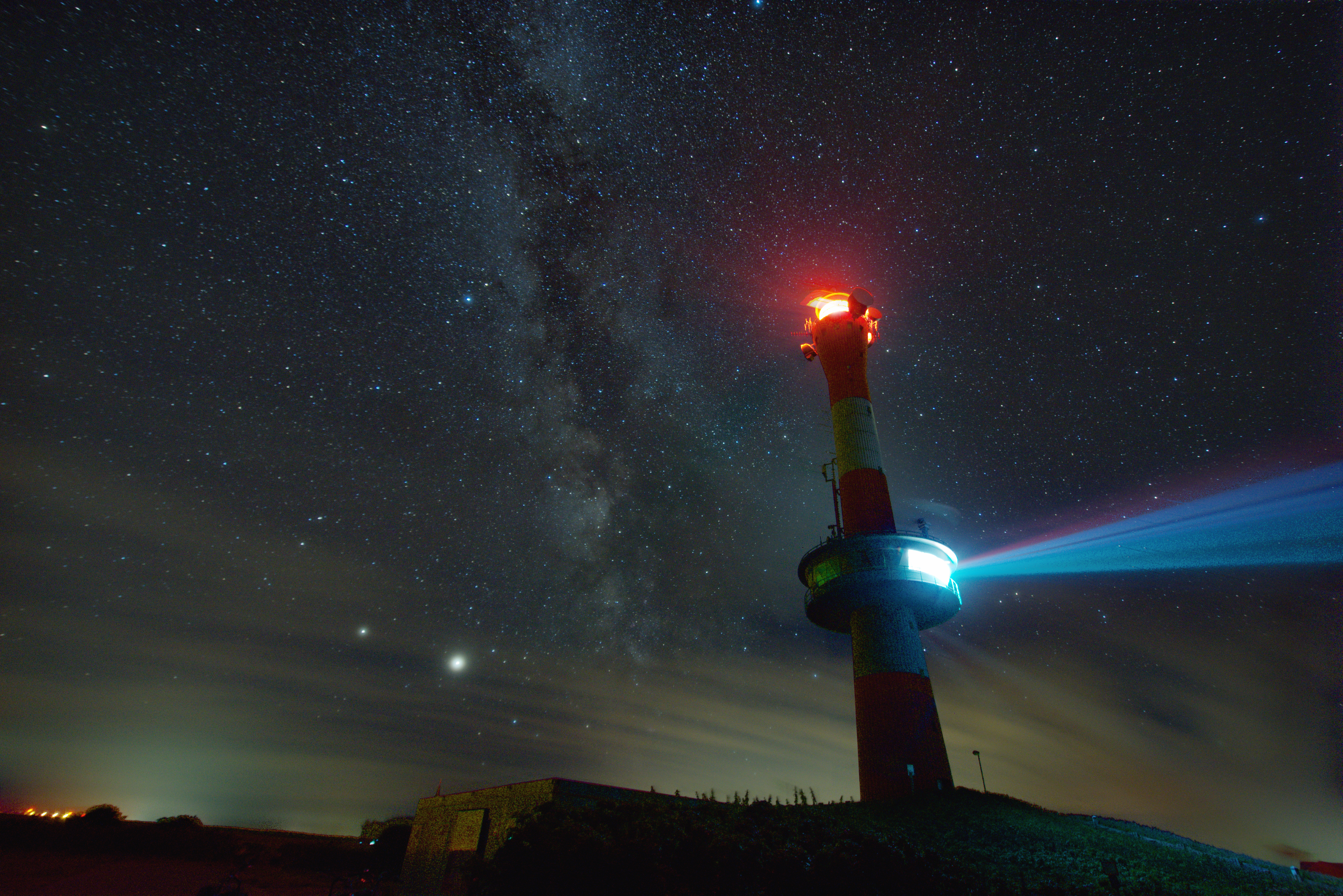 Schon länger hatte ich diese Bildkomposition im Kopf. Im letzten Urlaub konnte ich das Bild dann endlich aufnehmen. Zu sehen ist die Milchstraße neben dem neuen Leuchtturm von Wangerooge. Ungeplant, aber doch schön, haben sich Jupiter und Saturn noch ihren Platz im Bild erschlichen.