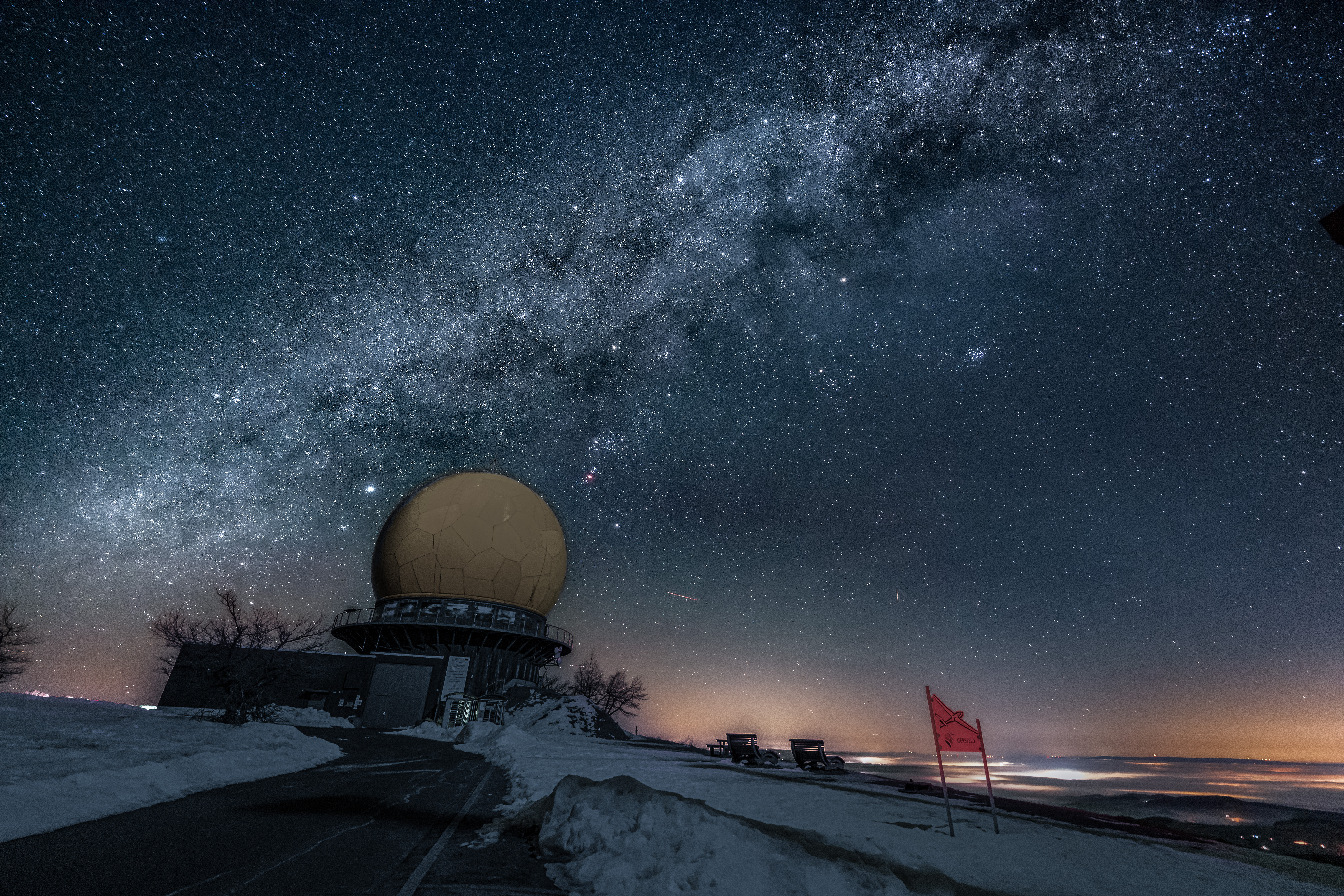 Milchstraße und Orion über dem Radom der Wasserkuppe, Aufnahme vom Dienstag, im Tal sieht man das Nebelmeer. Aufnahmedaten: Singleshot, Sony A7IV mit 14 mm f1,8 15 sec ISO 12800, entwickelt mit Photoshop.