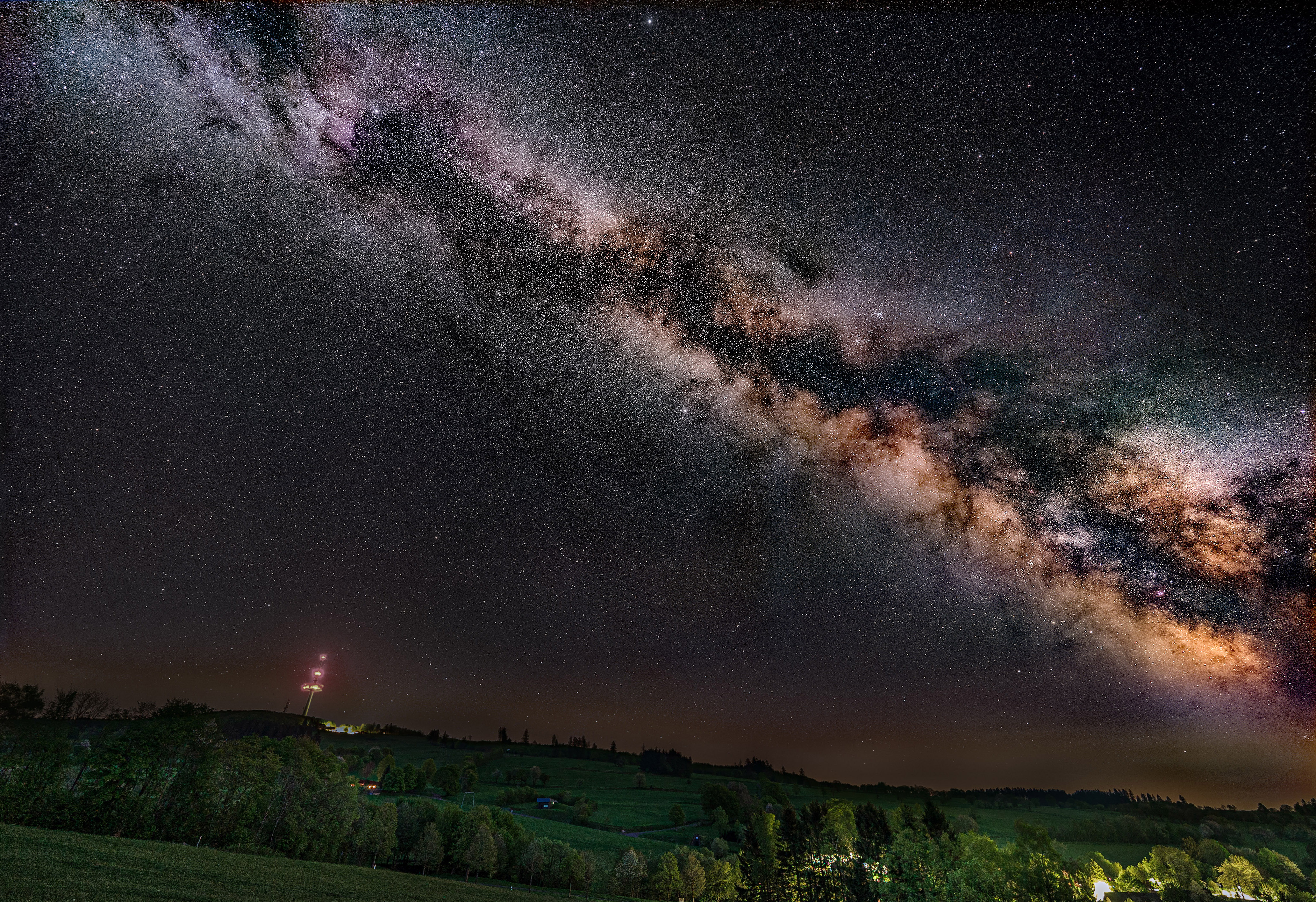 Milchstraße vom Samstag am Hoherodskopf, Sony A7s mit 14 mm, f2,8, 70 x 8 sec bei ISO 25600. Gestackt mit Sequator, bearbeitet mit Photoshop. Der Vordergrund wurde extra mit vier Minuten Belichtungszeit aufgenommen