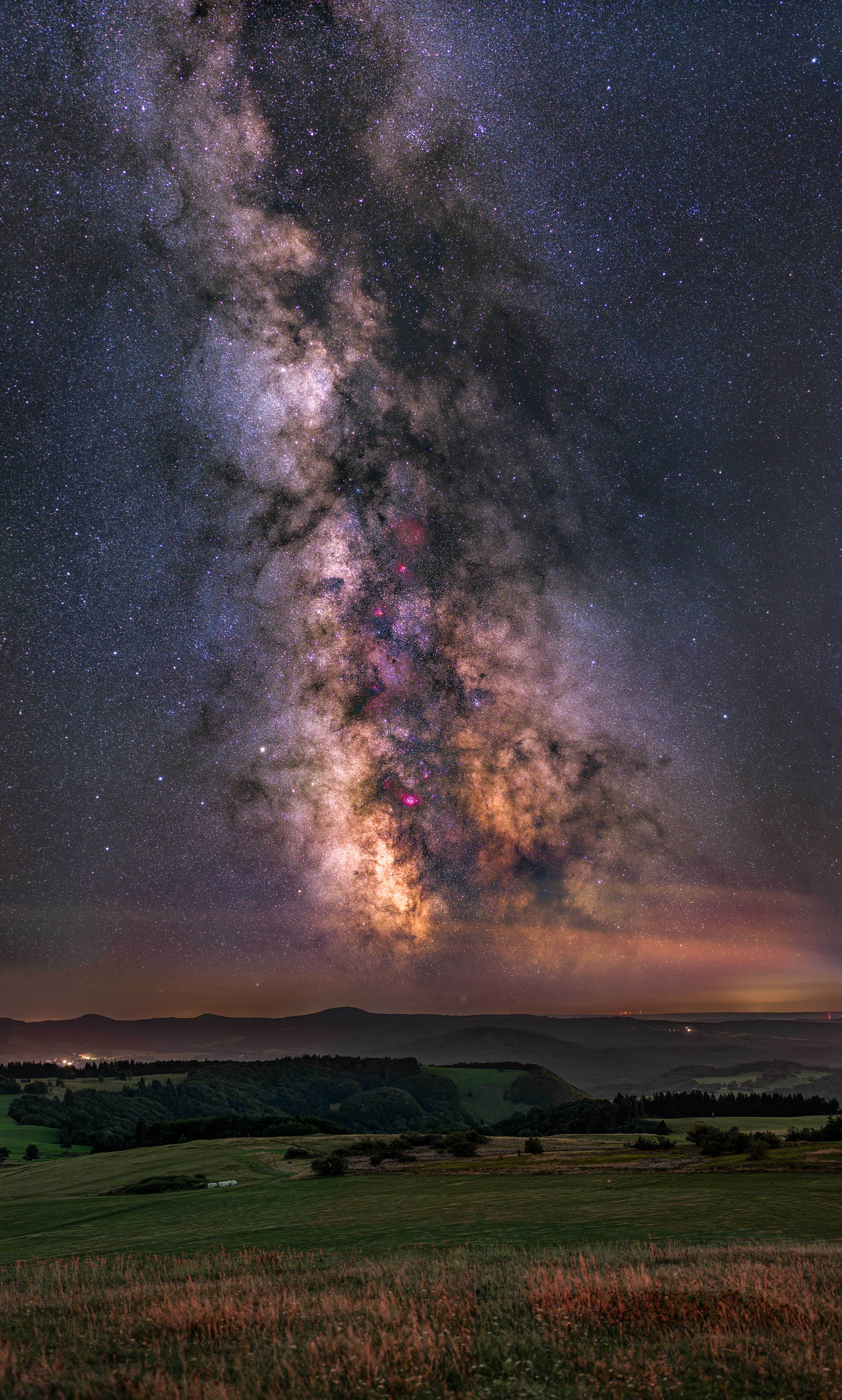 Hallo Astrofreunde, ich habe wieder ein Milchstraßenbild fertig, aufgenommen vorletzte Nacht auf der Wasserkuppe. Es war wohl die letzte Möglichkeit, dieses Jahr das Milchstraßenzentrum noch drauf zu bekommen, da es nun die nächsten Wochen immer weiter untergeht. Diese Aufnahme war etwas aufwändiger, es wurden 308 Aufnahmen gestackt und mit dem Laptop brauchte ich mehr als fünf Stunden, um die Aufnahmen mit Sequator zu stacken.