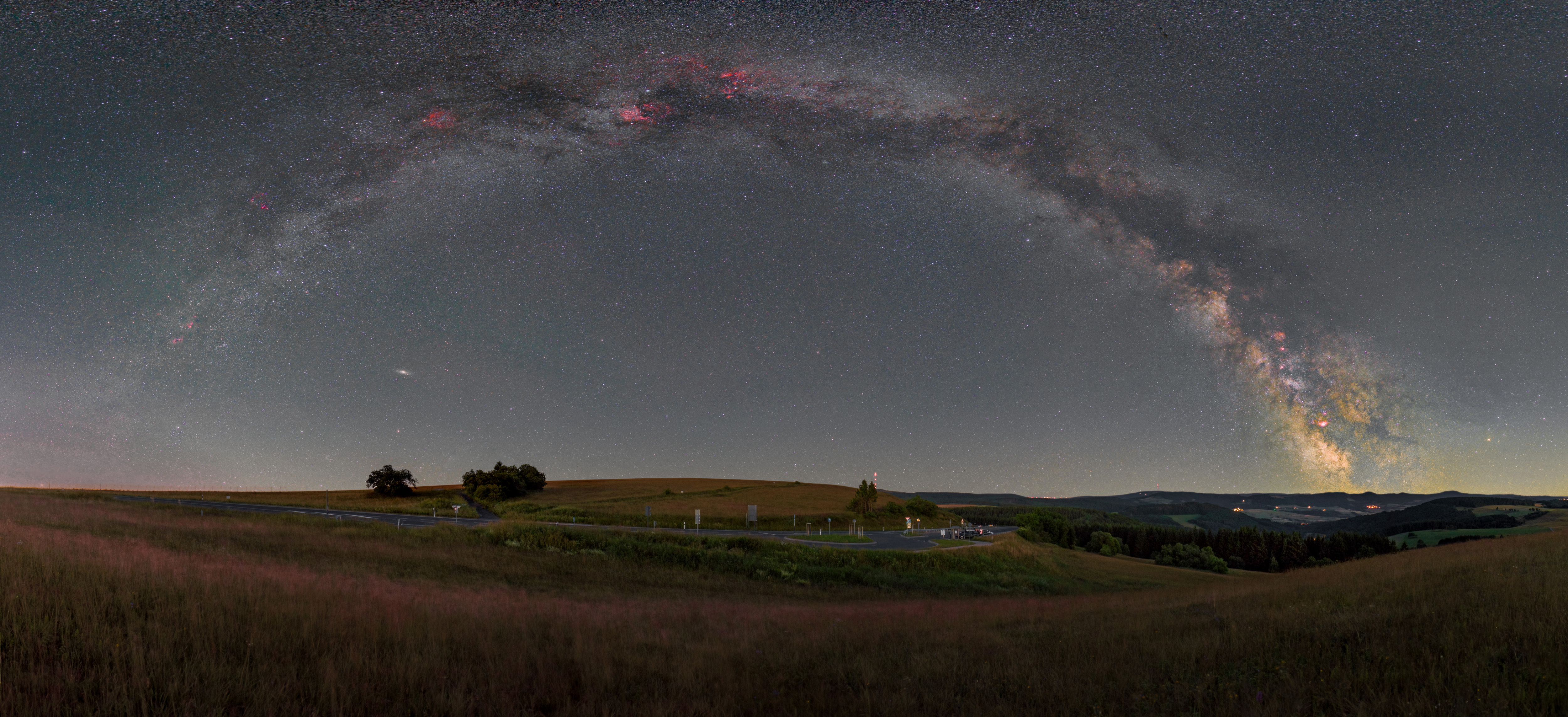 Das Panorama unserer Milchstraße ist in einer sehr dunklen Gegend Deutschlands entstanden - im Sternenpark Rhön an der Wasserkuppe. Das Panorama besteht aus zwei Reihen - Vordergrund und Himmel. Der Himmel mit Milchstraße besteht aus fünf Hochkantaufnahmen, jede davon ist ein Stack aus sechs Einzelbelichtungen.