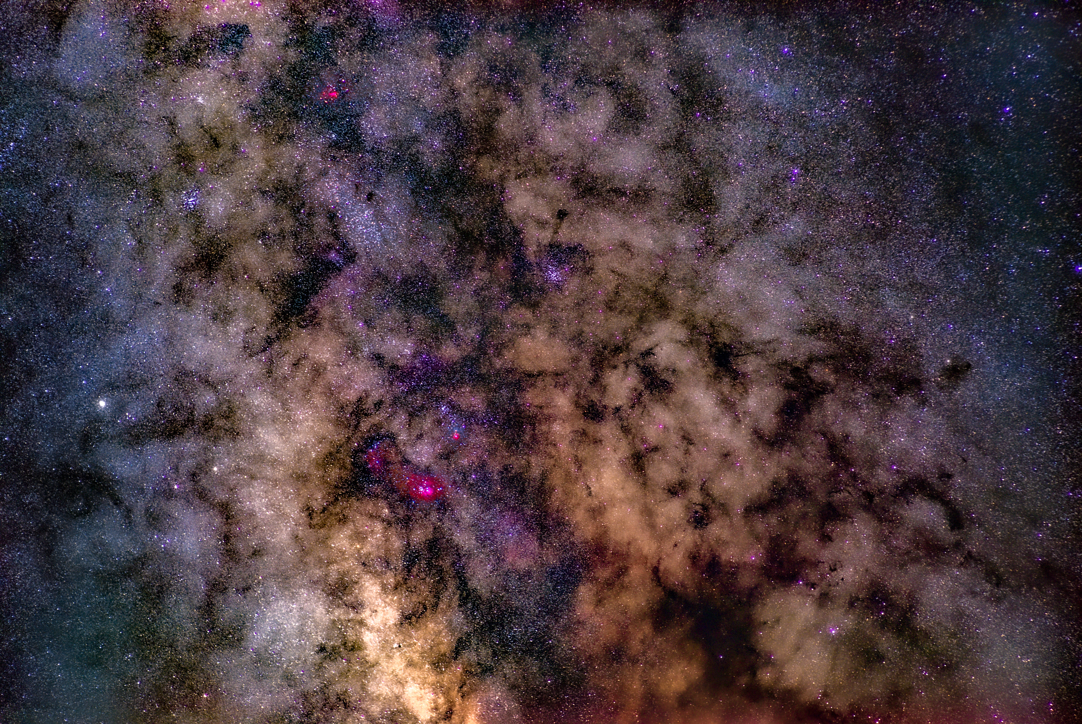 Milchstraßenzentrum mit Lagunennebel, aufgenommen am 3.Juli in der Rhön, Sony A7s auf Fotostativ ohne Nachführung, 263 x 4 sec belichtet, ISO 6400, Zeiss Contax Planar 85 mm, f1,4, gestackt mit Sequator und bearbeitet mit Photoshop.