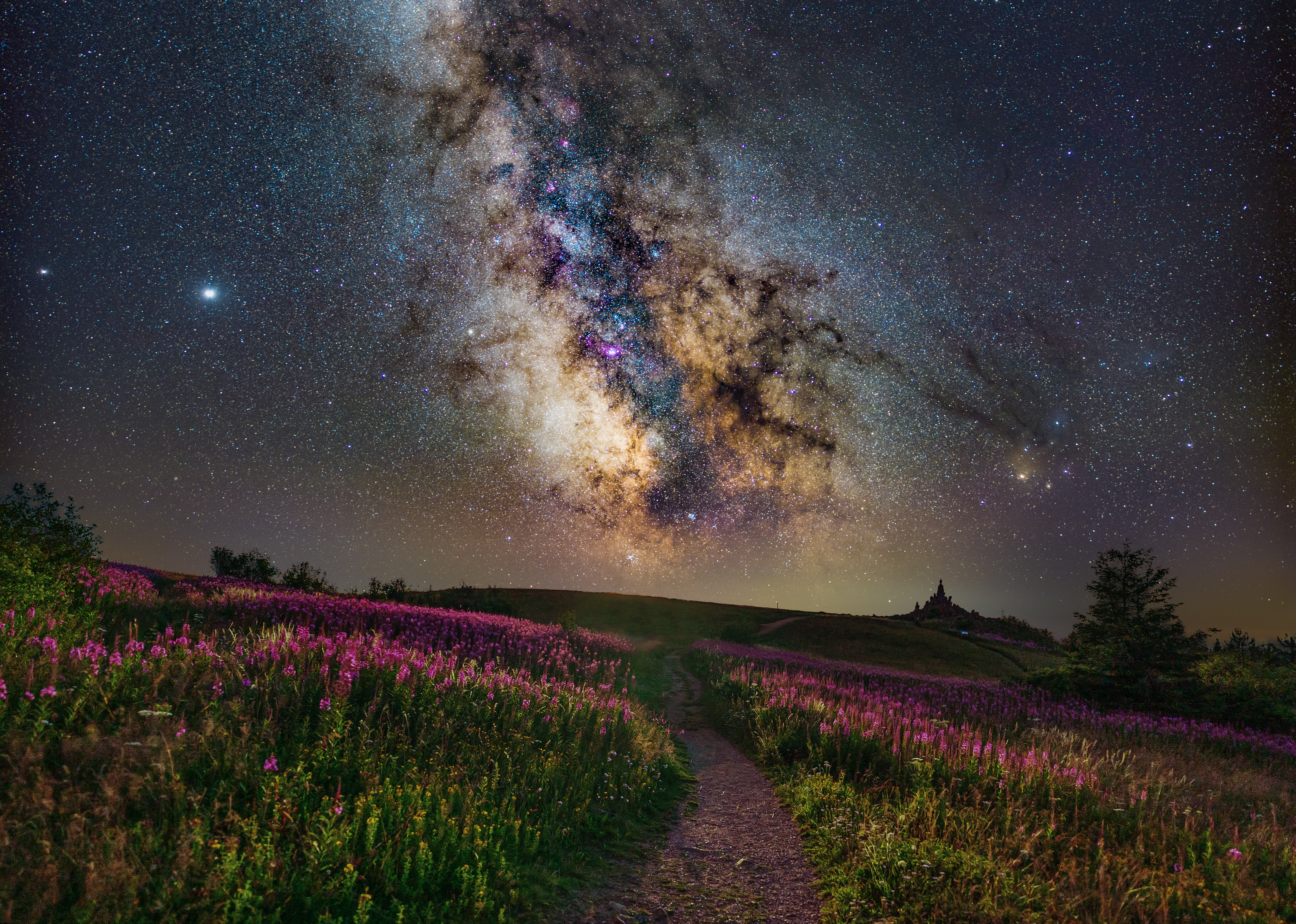 Milchstraßenzentrum über der blühenden Wasserkuppe. Komposit aus zwei Aufnahmen.