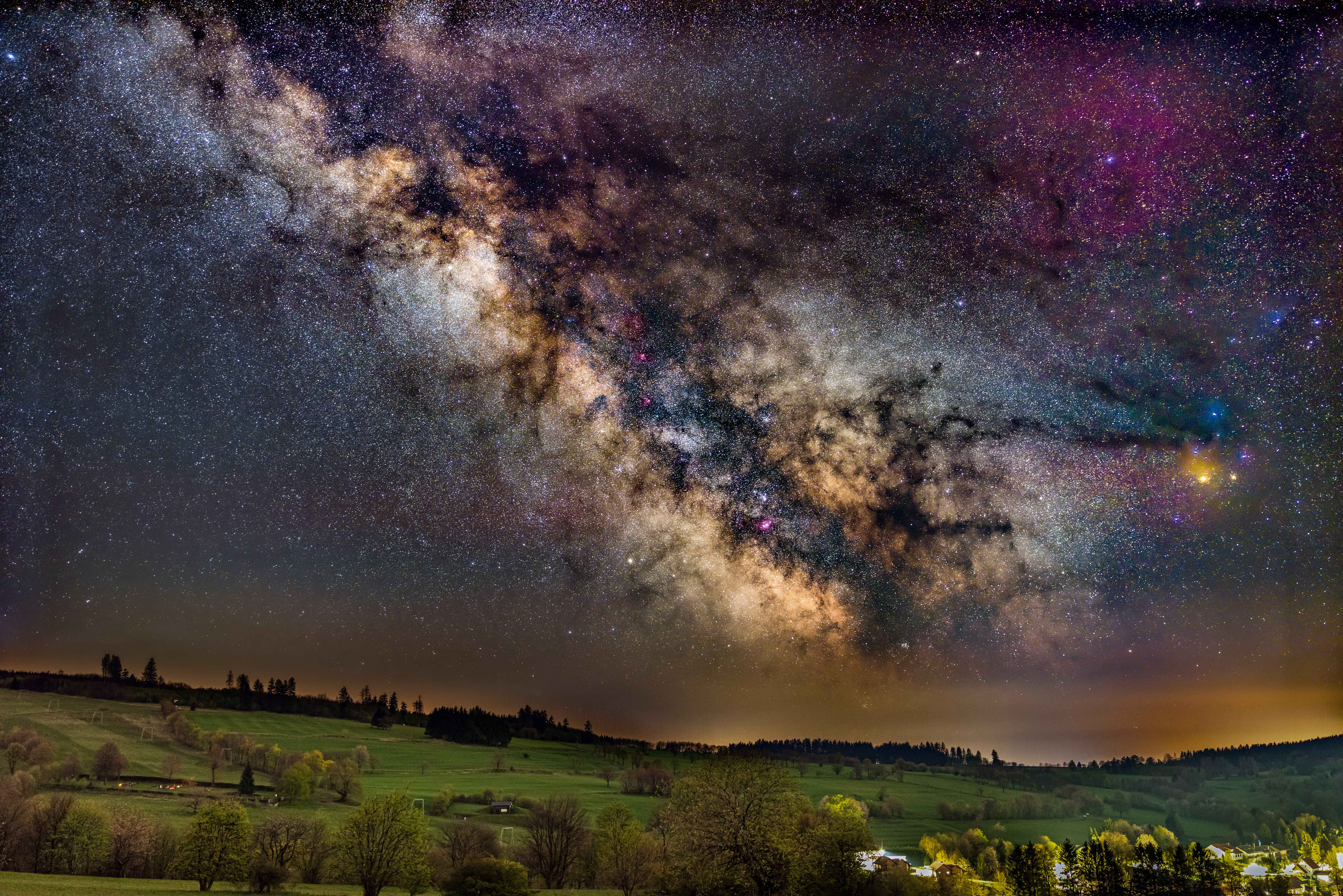 Milchstraßenzentrum vom Hoherodskopf aufgenommen, am 28. April 2022, Nikon D810 mit Sigma Art 28 mm, abgeblendet auf 1,8, belichtet 184 x 6 sec. bei ISO 12800. Gestackt wurde mit Sequator und mit Photoshop optimiert, Sequator benötigte auf meinem neuen Laptop etwa vier Stunden, um die 184 Aufnahmen zu verrechnen. Der Vordergrund wurde extra vier Minuten belichtet mit ISO 1600 und mit Photoshop überblendet, unten rechts sieht man die Ortschaft Breungeshain.